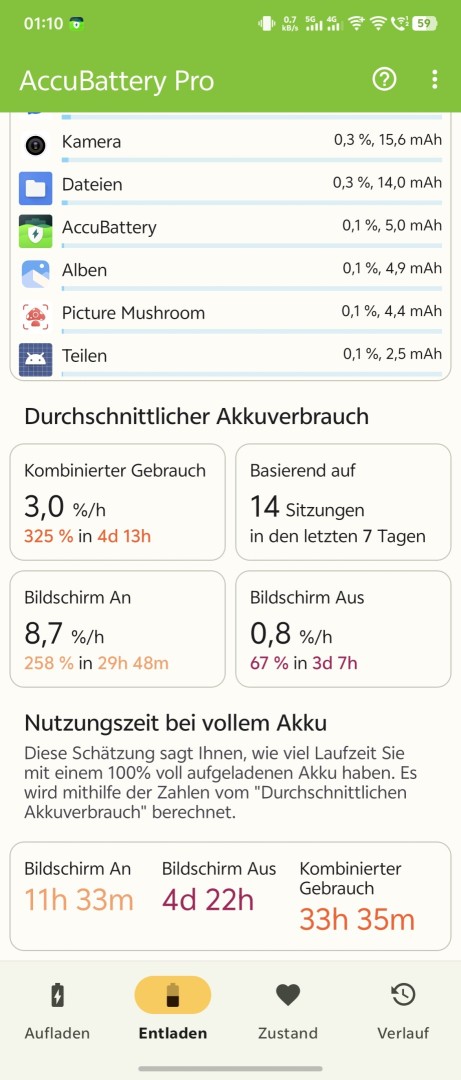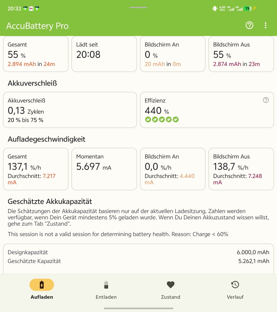 Die Akkulaufzeiten waren bei Foldables immer ein Problem. Dank der steigenden Energiedichte der Silizium-Kohlenstoff-Akkus bessert sich das. So kommt im X Fold 5 ein Dual-Cell-Akku mit 3275mAh und 2725mA zum Einsatz, insgesamt also stolze 5807mAh bei unter 5 Millimetern Gehäusedicke im aufgeklappten Zustand. Die Laufzeit fällt entsprechend gut aus. Man kommt stets ohne Probleme durch den Tag, auch bei intensiverer Nutzung der Kamera. Volle zwei Tage sind aber zumindest mit aktivem AOD nicht möglich, bei sparsamerer Alltagsnutzung muss man nach etwa anderthalb Tagen ans Netzteil. Je nach Bildschirmhelligkeit und Art der Nutzung sind Screen-On-Zeiten im Bereich von 9 bis 11 Stunden im Dauerbetrieb erreichbar. Wer hauptsächlich das größere Innendisplay nutzt, muss sich auf eine etwas reduzierte Laufzeit einstellen, vor allem bei hoher Helligkeit.