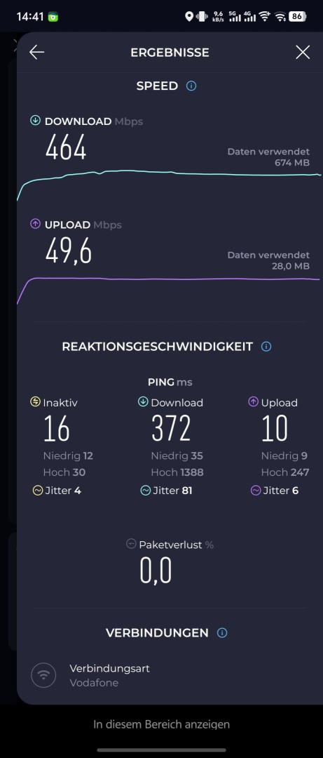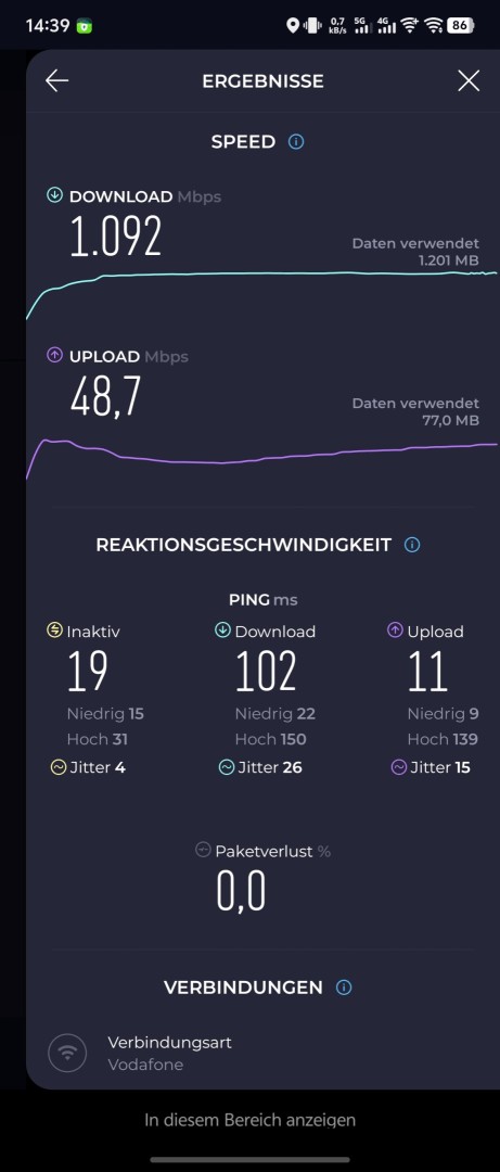 Das Vivo X Fold 5 unterstützt AX- und BE-WLAN, also Wi-Fi 6, 6E und 7. Der WLAN-Empfang im Test mit einer Fritz!Box 6660 Cable (Wi-Fi 6) war exzellent. Im Downstream-Speedtest wurden 1092 Megabit pro Sekunde (Vodafone Gigabit Kabel Tarif) direkt neben dem Router erreicht. Ein Stockwerk unter dem Router waren es noch hervorragende 464 Megabit pro Sekunde.