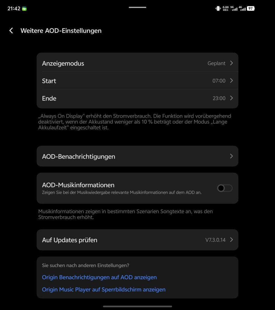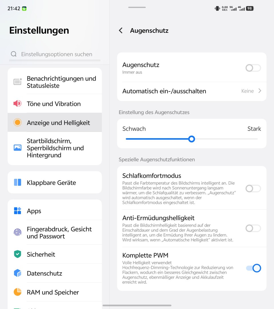 Das Vivo X Fold 5 bietet die üblichen Android-Einstellungen wie Helligkeit, Darkmode, Lesemodus und Skalierung. Hinzu kommen Augenschutzoptionen inklusive optional zuschaltbarem DC-Dimming statt Hochfrequenz-PWM-Dimming. Das Farbmanagement umfasst Presets und einen Farbtemperaturregler, erweiterte Farboptionen zur manuellen Kalibrierung fehlen jedoch. Bei der Bildfrequenz kann zwischen Automatik, festen 120 Hertz oder 60 Hertz gewählt werden. Optional lässt sich eine dynamische Bildoptimierung zuschalten. Beide Displays unterstützen ein echtes Always-On-Display mit den Modi Dauerhaft, nach Zeitplan, bei Bewegung oder beim Antippen. Das Design des AOD lässt sich anpassen und zeigt Benachrichtigungen an. Eine besondere Funktion ist das optionale Tischkalender-AOD beim Aufstellen des Geräts im Zeltmodus, für das verschiedene Designs ausgewählt werden können.