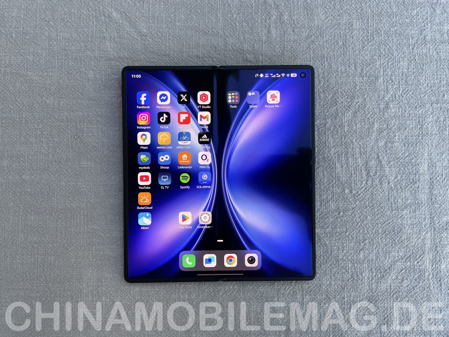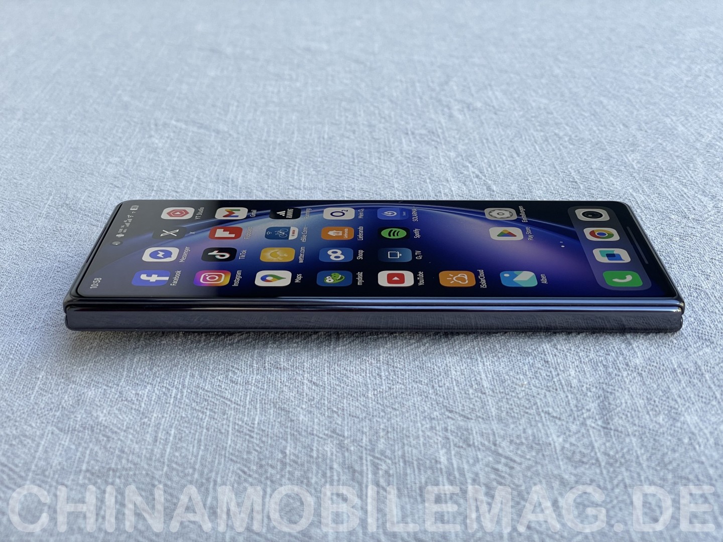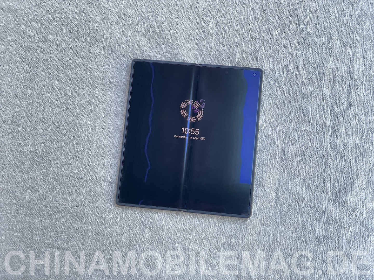 Das Display punktet mit sehr schlanken Bildschirmrändern identischer Breite an allen Seiten. Die Frontkamera in der rechten oberen Ecke beziehungsweise links oben im Querformat stört wenig. Qualitativ handelt es sich um ein hochwertiges flexibles AMOLED-Panel. Die mittige Falte ist nur bei seitlichem Blick zu erkennen, beim Darüberstreichen spürt man sie allerdings deutlich.