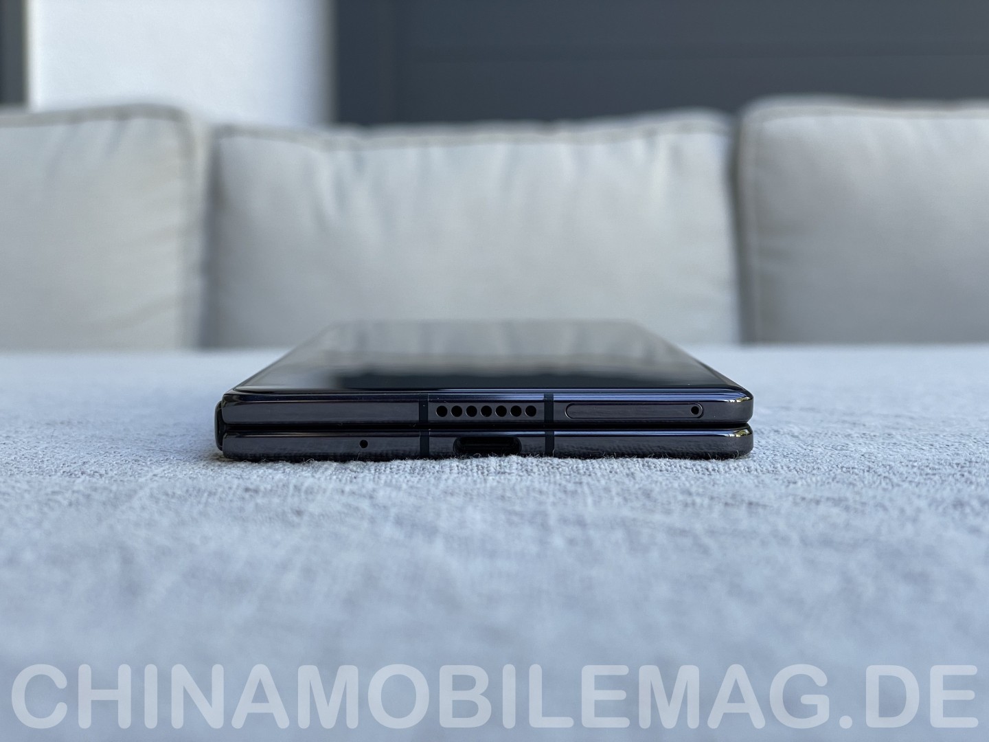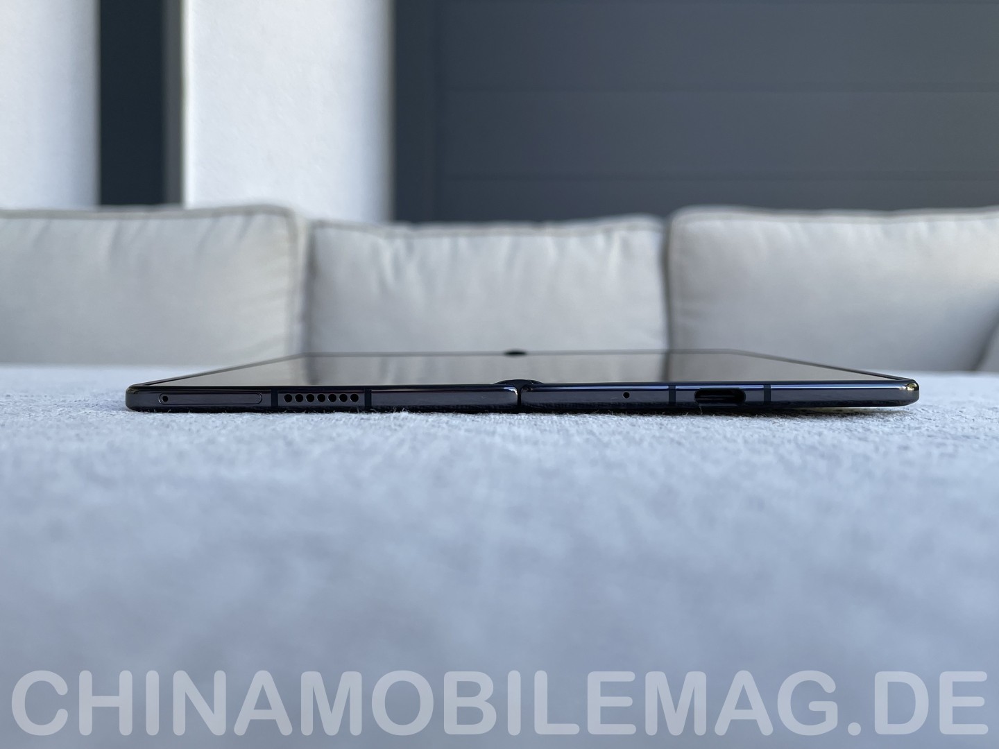 SIM-Tray und USB-C-Port befinden sich an der Unterseite zusammen mit einer Lautsprecheröffnung. Die Oberseite trägt eine weitere Lautsprecheröffnung, ein Umgebungsmikrofon und einen Infrarotblaster. Das Scharnier macht beim Aufklappen einen soliden und hochwertigen Eindruck, wackelt nicht und hält das Gerät fest geöffnet oder geschlossen. Beim Öffnen und Schließen entsteht allerdings ein "klebrig schmatzendes" Geräusch. Laut Berichten im Netz ist dies ein gängiges Problem bei Foldables und wird durch das flexible Panel verursacht - das Geräusch stellt keinen Defekt oder Grund zur Sorge dar. Zusammengeklappt schließen die beiden Hälften recht gut, nur selten findet sich Dreck auf dem Innendisplay, der vom Transport stammt. Kleinere Partikel sorgen im zusammengeklappten Zustand nicht für Kratzer auf dem Innendisplay, da die beiden Hälften einen gewissen Abstand zueinander haben. Das Display wird von einer überstehenden Kunststoffeinfassung geschützt.