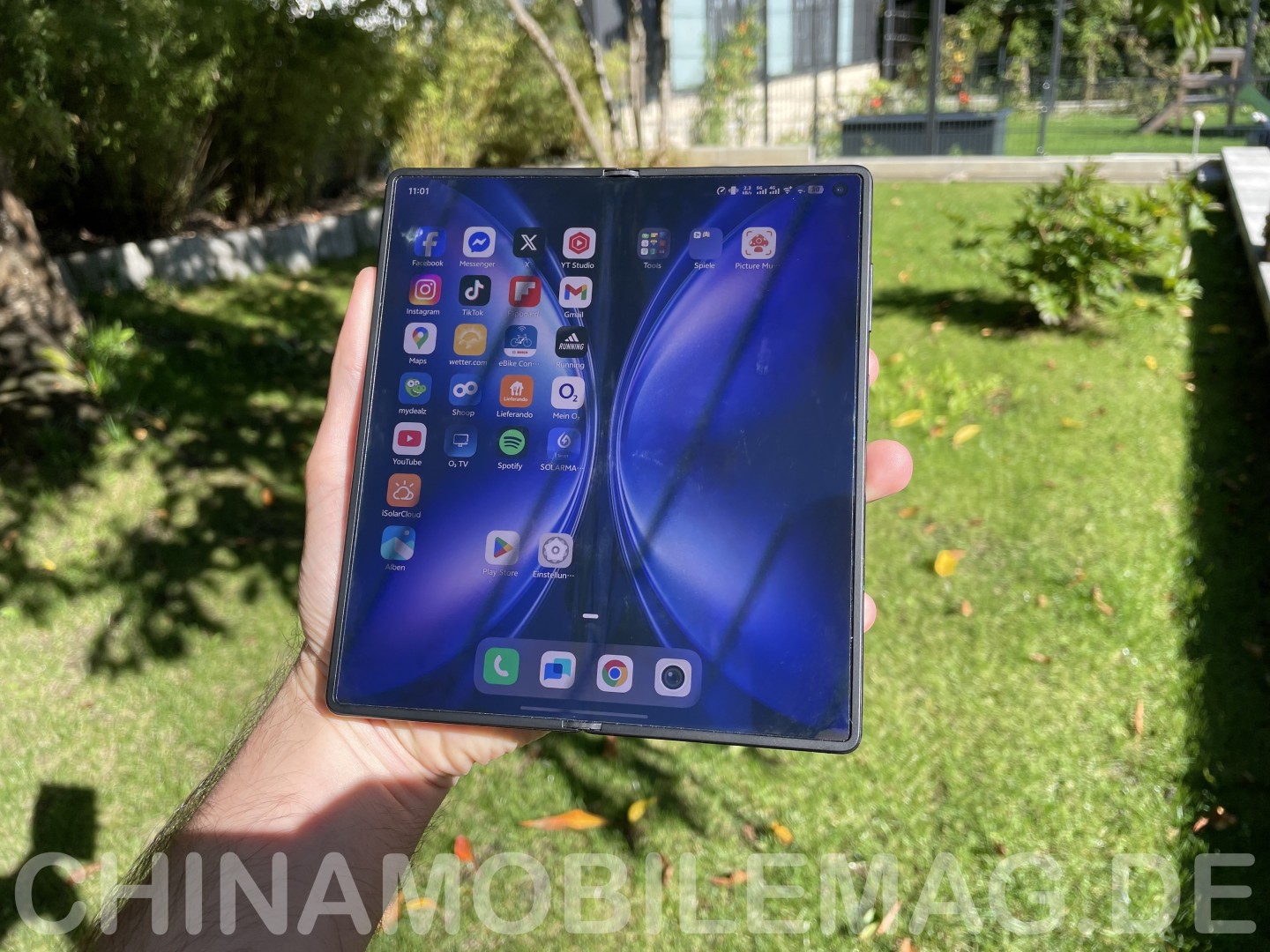 Die 120 Hertz liefern eine flüssige Darstellung beim Scrollen. Die Pixelreaktionszeit ist hoch genug, um starkes Verwaschen oder Schlierenbildung zu verhindern. Die Bildschirmränder fallen bauartbedingt etwas breiter aus als bei normalen Smartphones, da der Metallrahmen etwas in die Front hineinragt, um die Stabilität des dünnen Aufbaus zu verbessern.