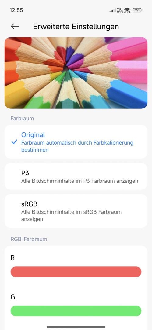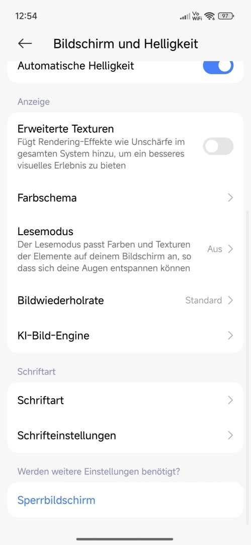 Die Display Einstellungen fallen umfassend aus und entsprechen den Oberklasse Geräten von Xiaomi. Neben Android Standardeinstellungen gibt es auch ein Farbmanagement. Voreingestellte Farbprofile stehen zur Verfügung, die Farbtemperatur kann für jedes angepasst werden. Der Profi Modus bietet manuelle Einstellungen zur Kalibrierung wie Gamma, Kontrast und RGB Werte. Ein Lesemodus mit warmen Farben ist vorhanden. Bei der Bildwiederholrate gibt es keine Möglichkeit zur Limitierung auf beispielsweise 90Hz zum Stromsparen. Die KI-Bild-Engine umfasst Video-Upscaling, HDR Verbesserung und MEMC. Ein echtes Always-On Display (AOD) mit permanenter und geplanter Anzeige ist vorhanden und zeigt Uhrzeit, Datum, Ladestand und Benachrichtigungen. Das Design des AOD lässt sich recht umfassend anpassen mit verschiedenen Uhren-Stilen, Größen und Grafiken.