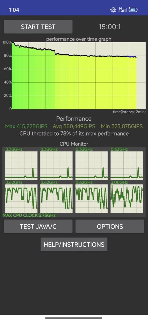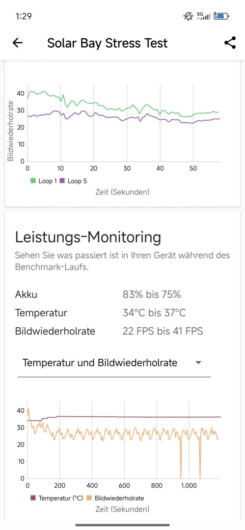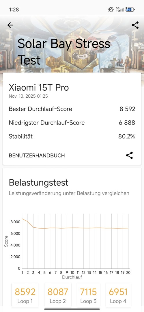 Die Wärmeentwicklung ist dabei deutlich spürbar, das Xiaomi 15T Pro wird aber nicht unangenehm heiß. Im wenig fordernden Alltagsgebrauch erwärmt sich das Gerät kaum bis nur leicht. Die Kühlung hat Xiaomi gut umgesetzt, wie verschiedene Drossel-Tests zeigen. Im CPU Throttling Test fällt die Leistung nur langsam ab und kommt nach 15 Minuten noch auf 78% der Maximalleistung. Im Solar Bay Stress Test erreicht die GPU eine sehr gute Stabilität von 80,2%.