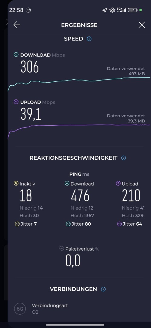 Das Xiaomi 15T Pro unterstützt Mobilfunk bis 5G. Die Frequenzabdeckung fällt umfassend aus und deckt Europa sowie andere Regionen der Welt ab. Dual SIM ist mit zwei Nano SIM Karten oder einer eSIM möglich. Der Empfang zeigt sich trotz Metallrahmen sehr gut, auch im Haus und in schwächer abgedeckten Räumen oder Gegenden. Unerwartete Signalabbrüche traten nicht auf. Im Speed Test liefert das Smartphone eine sehr gute Performance. Im o2 5G Netz wurden nachts 306Mbit/s im Download und 39Mbit/s im Upload erreicht.