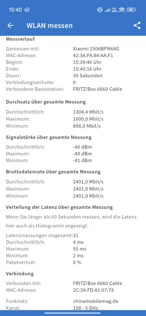 Die WLAN Unterstützung bleibt wie gehabt mit Wi-Fi 6/6E und Wi-Fi 7 (ax / be). Die Geschwindigkeit fällt exzellent aus, neben einer Fritz!Box 6660 Cable wurden im Schnitt 1304Mbit/s erreicht. Der 5GHz Empfang zeigt sich nicht ganz so stark, ein Stockwerk unter dem Router wechselt das Smartphone ins 2,4GHz Band. Dort liefert es aber immer noch sehr solide 190Mbit/s und das stabil.
