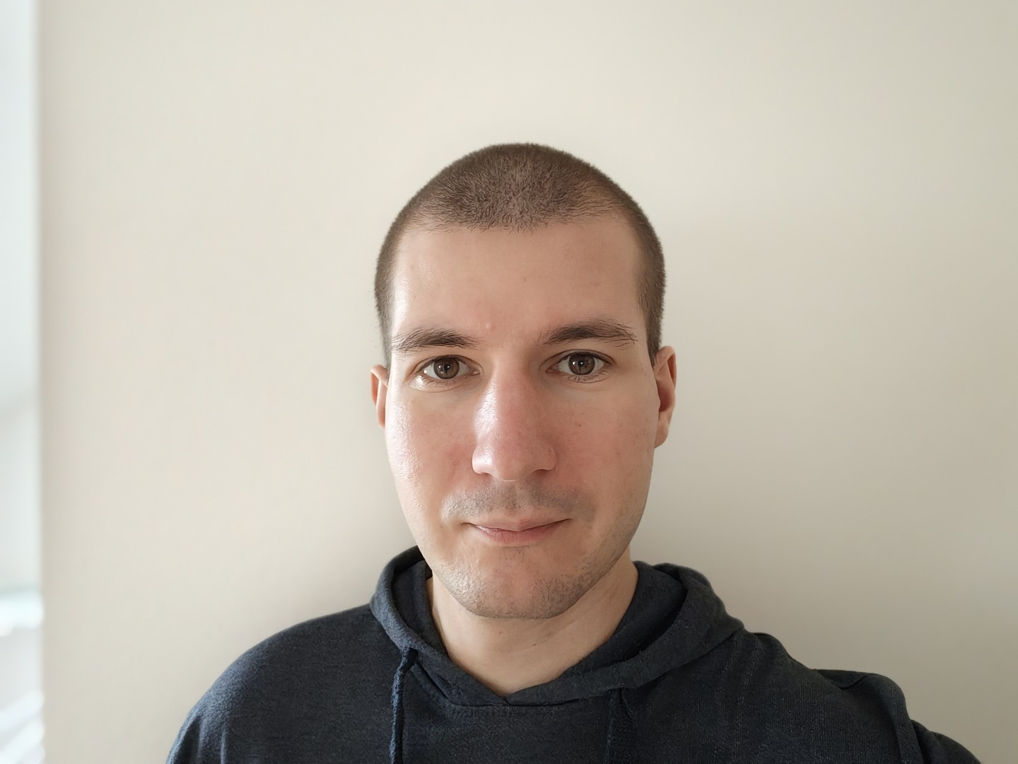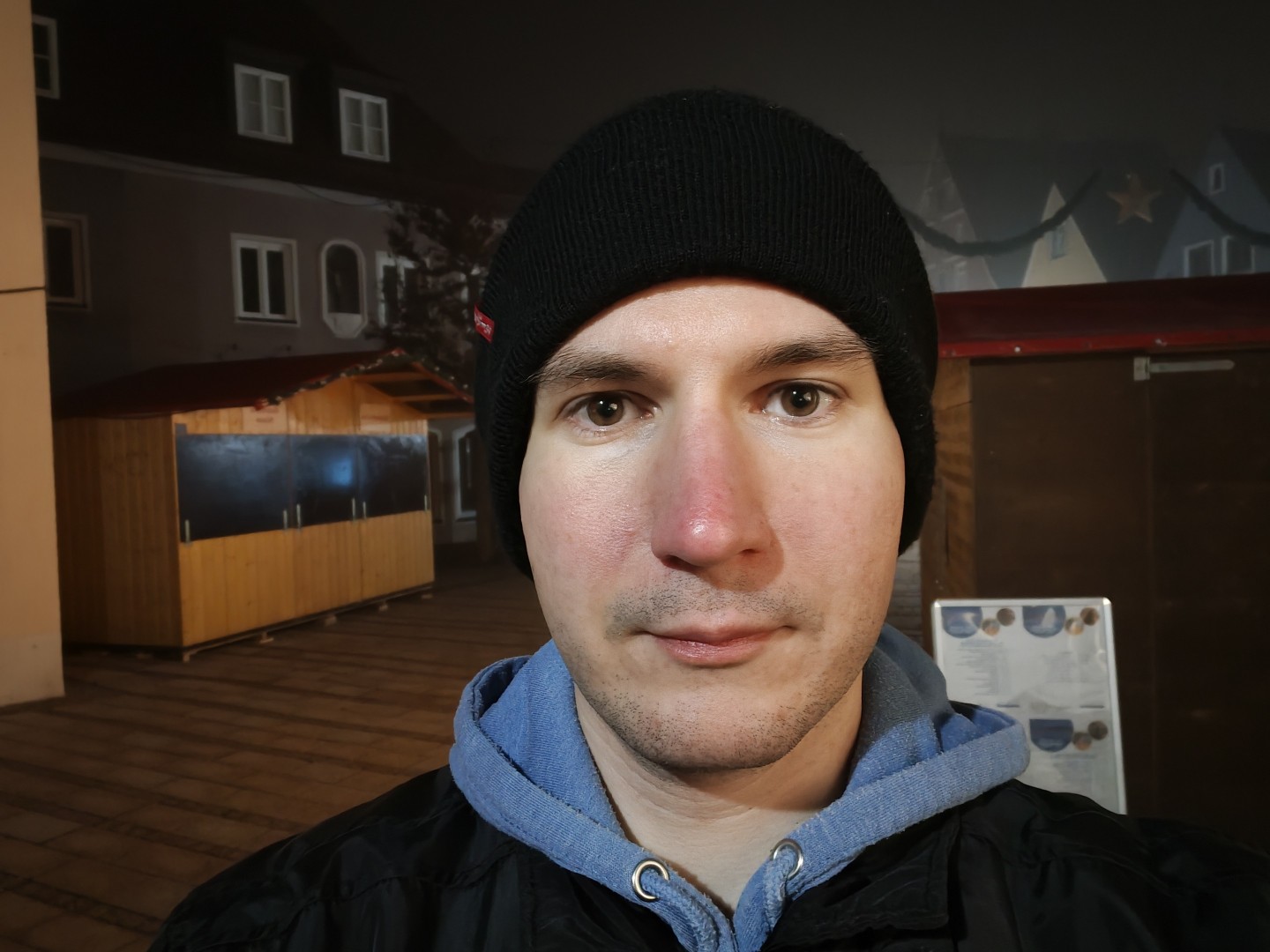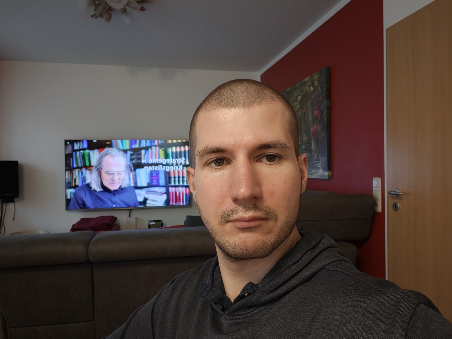 Die Frontkamera landet trotz 50MP Sensor und Pixel Binning im 12MP Modus nur im Mittelfeld. Im Freien entstehen sehr gute Selfies mit guter Schärfe. In Gebäuden an einem Fenster zeigt sich allerdings schon ein deutlicher Abfall der Qualität mit deutlicher Unschärfe und Matschigkeit der Texturen, wahrscheinlich durch Rauschunterdrückung. Nachtaufnahmen mit Straßenbeleuchtung gelingen immerhin ohne weiteren Qualitätsverlust. Nachtaufnahmen mit denselben Lichtverhältnissen im Portrait Modus fallen hingegen deutlich unscharf aus. Der Bildschirm Blitz erweist sich als unbrauchbar und erzeugt starkes Bildrauschen sowie ein milchiges Aussehen der Bilder. Hier scheint die Software ein Problem zu haben.