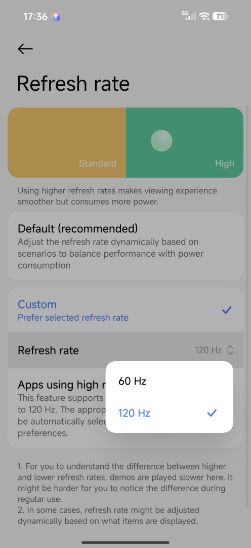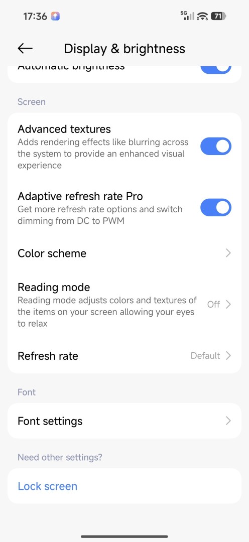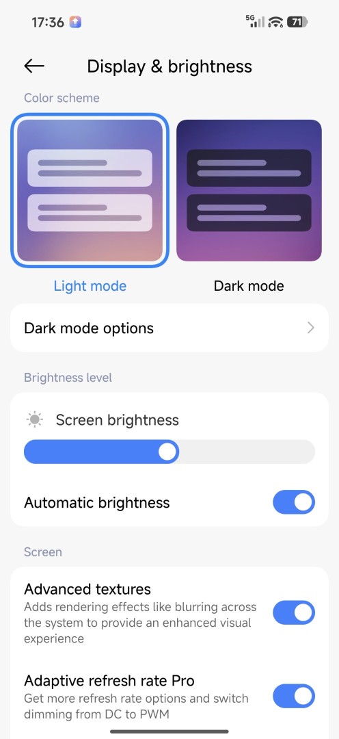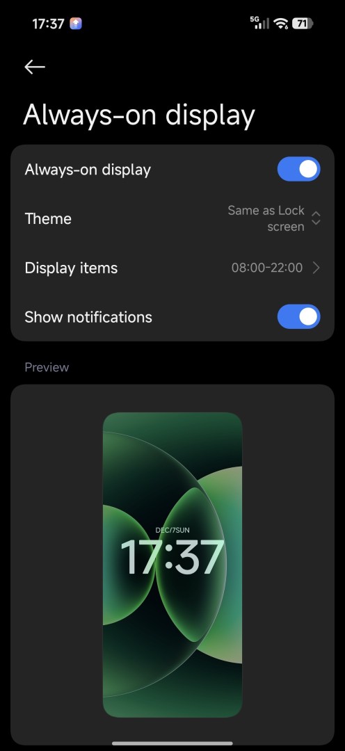 Die üblichen Android Standardeinstellungen sind vorhanden. Das Xiaomi Farbmanagement in der China Version von HyperOS zeigt sich leider eingeschränkt. Hier gibt es nur Presets, keine Profi-Einstellungen für manuelle Kalibrierung. Da die Werkskalibrierung jedoch ziemlich gut ausfällt, dürfte sich daran kaum jemand stören. Ein echtes Always-On Display ist vorhanden, wahlweise mit oder ohne Darstellung des Lockscreen Wallpapers. Die Benachrichtigungsanzeige auf dem AOD funkioniert. Der Displaybetrieb lässt sich optional auf 60Hz begrenzen. Die Displayansteuerung erfolgt standardmäßig mit DC-Dimming für niedrigere Helligkeitsstufen. Optional kann auf PWM-Dimming umgeschaltet werden, was dann mehr Frequenzbereiche für die Variable Refresh Rate freischaltet.