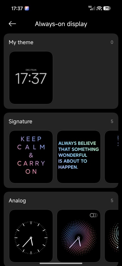 Das kleine 2,7 Zoll Display im Kamerabuckel füllt diesen komplett aus und sieht ansprechend aus. Es umfließt auch die beiden Kameralinsen. Wahlweise lässt es sich im AOD Betrieb nutzen oder per Doppeltippen aktivieren. Standardmäßig wird die Uhrzeit mit einem Hintergrundbild dargestellt. Weiterhin stehen Widgets, Benachrichtigungen und die Kamera-App zur Verfügung, um die Hauptkamera als Selfie Kamera zu nutzen.