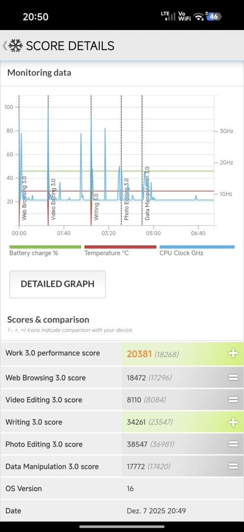 Dass sich das jedoch nicht zwingend auf den Praxistest übertragen lässt, hat der zuvor erwähnte Stress-Test mit "Genshin Impact" und "Honkai: Star Rail" im Parallelbetrieb gezeigt, wo das Xiaomi 17 Pro mehr Framerate Einbrüche zeigt als das Vivo X300 Pro. Das zeigt mal wieder, dass Benchmarks nicht zwingend die Realität abbilden müssen.