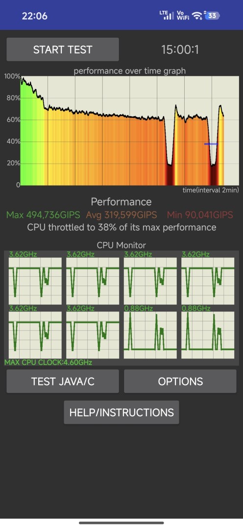 Im CPU Throttle Test benötigt das Xiaomi 17 Pro nicht lange zum ersten Leistungseinbruch. Schon nach rund zwei Minuten bricht die Leistung auf nur noch etwa 70% ein. Ab dann bricht sie langsamer ein bis auf etwa 60% nach 10 Minuten. Ab dann beginnen regelmäßige Einbrüche auf nur noch 20% der Maximalleistung für einige Sekunden, ehe es dann wieder auf die 60% hochgeht. Dieses Muster wiederholt sich ab dann regelmäßig.