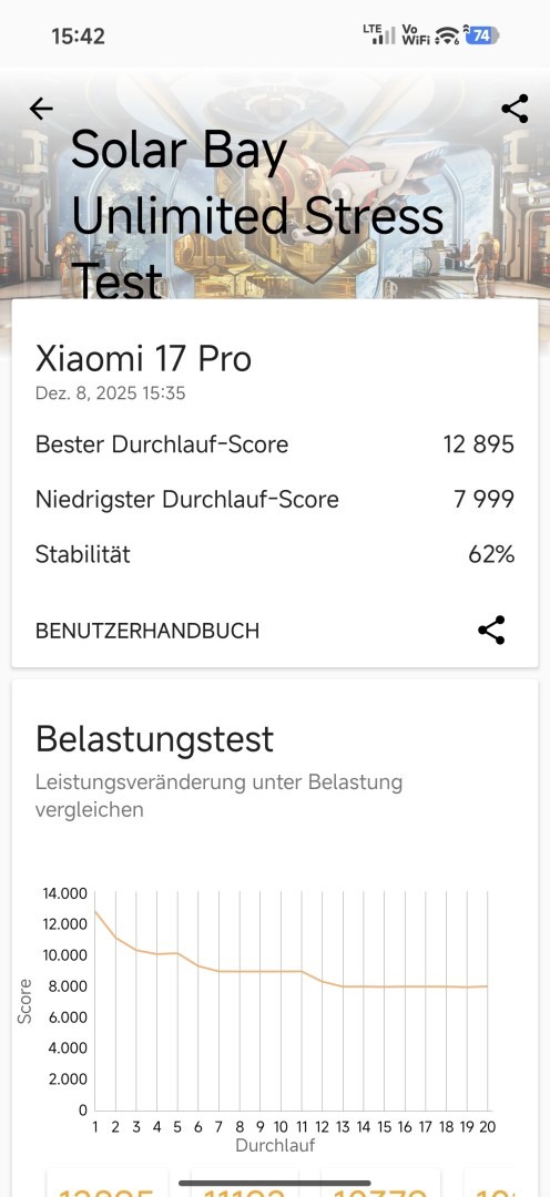 Auch die GPU des Snapdragon 8 Elite Gen 5 zeigt im Xiaomi 17 Pro erhebliches Thermal Throttling, wenngleich geringer als beim Dimensity 9500 im größeren Vivo X300 Pro, was durchaus überrascht, wenn man den Unterschied im Formfaktor der Geräte berücksichtigt. Hier kommt das Xiaomi 17 Pro im 3DMark Solar Bay Stress Test auf 62% der ursprünglichen Leistung nach 20 Durchläufen. Zum Vergleich: Das Vivo X300 Pro kam hier auf nur 49% Restleistung. So dreht sich dann der Spieß im gedrosselten Zustand um: War die GPU vom Dimensity 9500 vor dem Drosseln noch schneller, ist dann im gedrosselten Zustand die GPU vom Snapdragon 8 Elite Gen 5 etwas schneller.