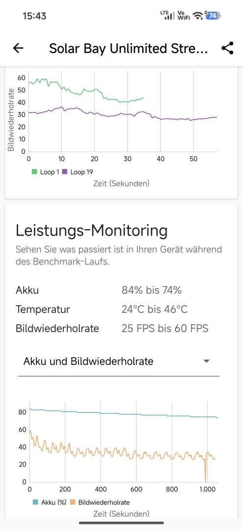 Ein deutlicherer Leistungsschub zeigt sich in Spielen, genau wie schon bei der Konkurrenz von Mediatek. "Honkai: Star Rail" lässt sich nun bei vollen Grafikeinstellungen mit stabilen 60fps spielen. Beim Snapdragon 8 Elite gab es da noch gelegentliche Einbrüche. Dies bleibt aber beim Xiaomi 17 Pro im Gegensatz zum größeren Vivo X300 Pro nicht auf Dauer so. Nach etwa 15 Minuten Spielzeit setzt spürbares Thermal Throttling ein, was die Framerate dann in den 40er Bereich drückt. Für anspruchsvolle Spieler ist das Xiaomi 17 Pro damit weniger geeignet. Beim Konkurrenten hatte das Thermal Throttling keine so stark spürbaren Auswirkungen auf die Framerate.