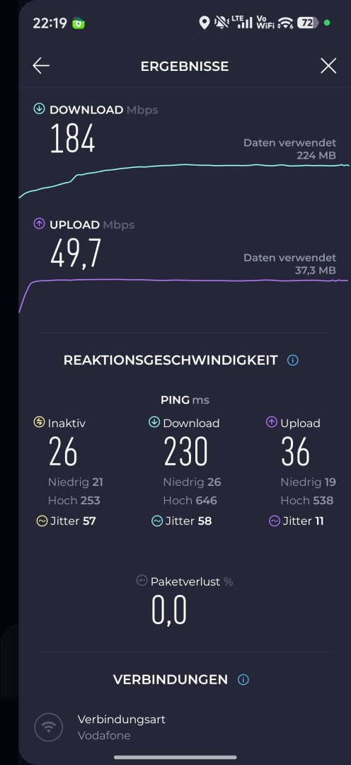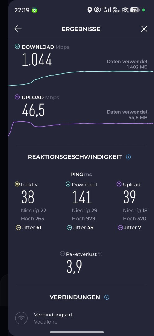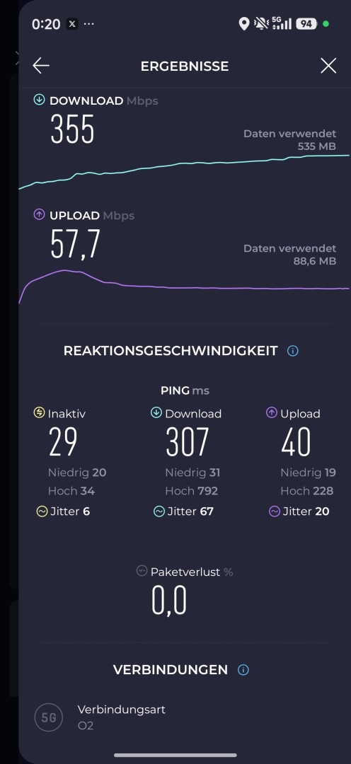 Im Test zeigte sich einwandfreier Empfang im Freien und in Gebäuden, auch schwach abgedeckte Gegenden bereiteten keine Probleme. Der 5G Speed Test ergab hohe Geschwindigkeiten von 355Mbit/s im Download und 57Mbit/s im Upload im o2 Netz bei Nacht. Dual SIM wird mit zwei Nano SIM Karten unterstützt. eSIM Support fehlt wie bei allen China Importen.