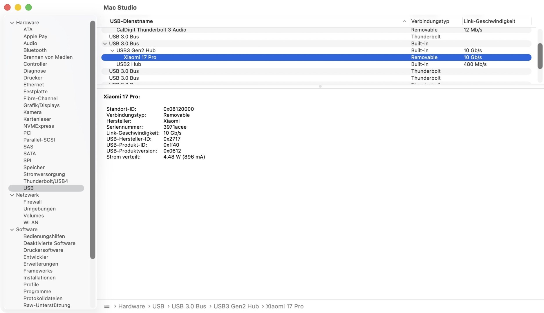 Der interne Festspeicher bietet ebenfalls gängige Optionen: 256GB, 512GB oder 1TB. Das Testgerät ist die 1TB Variante. Als Basis dient UFS 4.1 Speicher mit zu erwartenden Benchmarkergebnissen auf Augenhöhe mit der Konkurrenz: 4,47GB/s lesend, 4,31GB/s schreibend, jeweils sequenziell. Eine Micro SD Erweiterung ist wie üblich nicht möglich. Externer Speicher kann über USB-C schnell angebunden werden. Der USB-C Port vom Xiaomi 17 Pro bietet USB 3.2 Gen 2 mit 10Gbit/s, obwohl Xiaomi nur USB 3.2 Gen 1 (5Gbit/s) im Datenblatt angibt. Video-Out wird daran auch mit Screen Mirroring unterstützt.