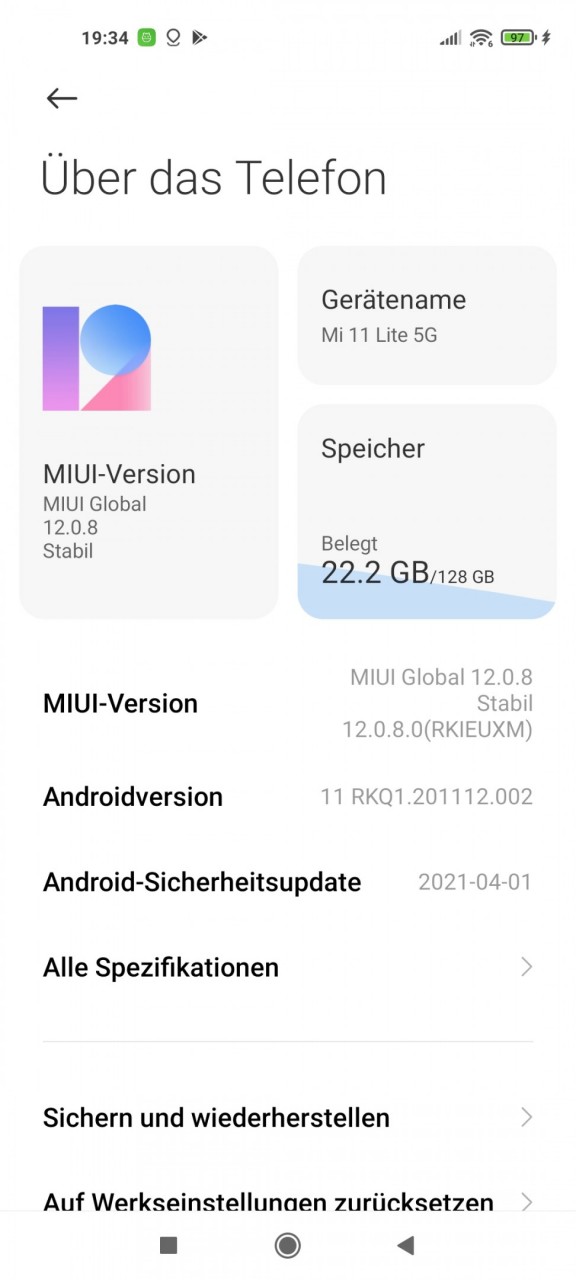 Auf dem Xiaomi Mi 11 Lite 5G läuft wie gewohnt MIUI Global. Hier kommt derzeit noch kein MIUI 12.5, sondern noch MIUI 12.0 zum Einsatz. Konkret handelt es sich im Test um die Version 12.0.8 wobei es im Testzeitraum ein Update gab. Diese basiert auf Android 11 und liefert mit April 2021 einen zum Release-Zeitpunkt des Updates relativ aktuellen Sicherheitspatch mit. Die Oberfläche bietet die gewohnte MIUI Nutzererfahrung mit den üblichen Features und Einstellungsmöglichkeiten. Die Sprachunterstützung ist in der Global Version wie gewohnt umfassend und die Google Apps und Dienste sind natürlich ebenso vorinstalliert. Project Treble wird vom Xiaomi Mi 11 Lite 5G nicht unterstützt. Für die Front- und Hauptkamera gibt es Camera2 API Support mit Level 3.