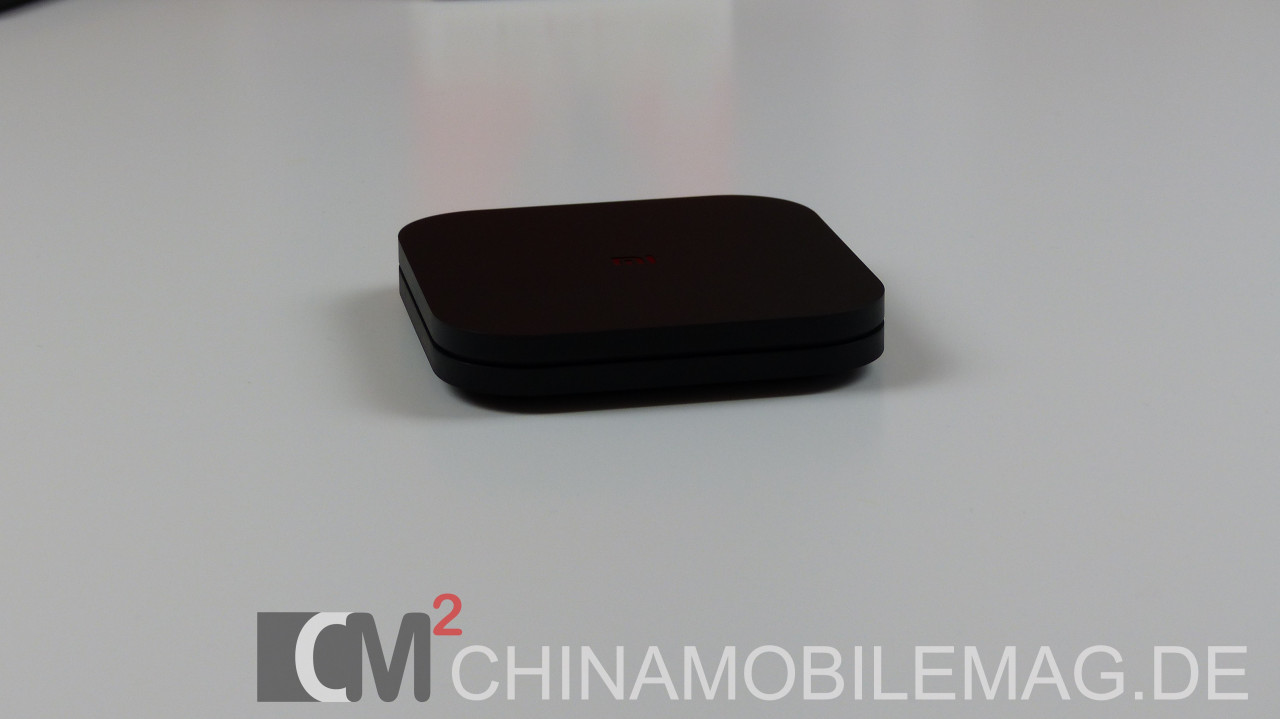 Die Mi Box S ist eine äußerst kompakte TV Box, welche in wirklich jedem Wohnzimmer einen Platz finden wird und sich bei Bedarf auch völlig unsichtbar platzieren lässt. Die kleine schwarze Box misst lediglich 95,1 x 95,1 x 15,9mm. Das Design ist sehr schlicht gehalten mit abgerundeten Ecken, einem vertieften Mi-Logo auf der Oberseite und einer Rille, welche sich einmal rings um das Gehäuse zieht. Das Gehäuse selbst besteht aus Kunststoff mit mattem Finish und fühlt sich hochwertig an. Als leichte Schwäche sehen wir jedoch die Standfüße auf der Unterseite an. Diese bestehen nur aus Kunststoff und nicht aus Gummi. Rutschfest ist die Mi Box S also nicht.