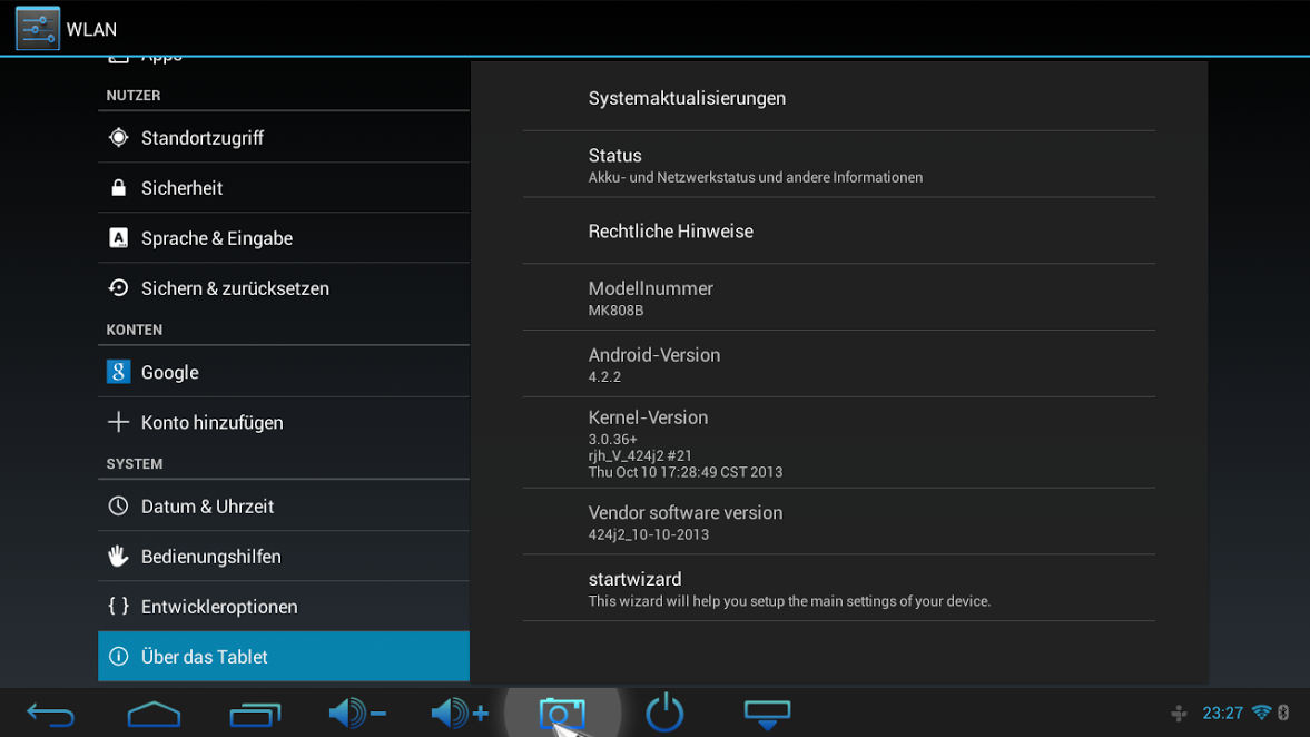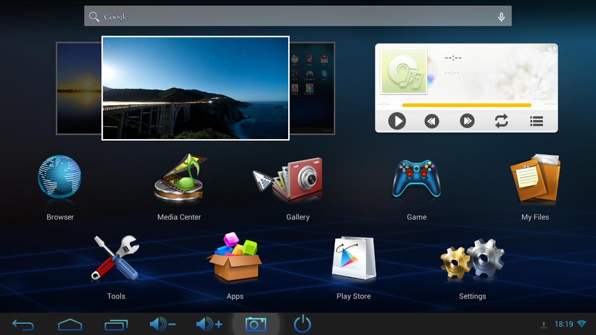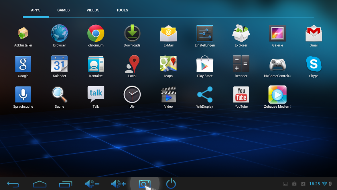 Der Bootvorgang dauert etwa 25 Sekunden, danach sehen wir den bereits eingerichteten Homescreen, der den Zugriff auf alle wichtigen Funktionen ermöglich. Außerdem sind bereits einige Apps vorinstalliert: die Standard-Google-Apps, ein Apk-Installer, ein Explorer, Chromium (Chrome-Browser), Skype, “Zuhause Medien Zentrum” und WifiDisplay.
