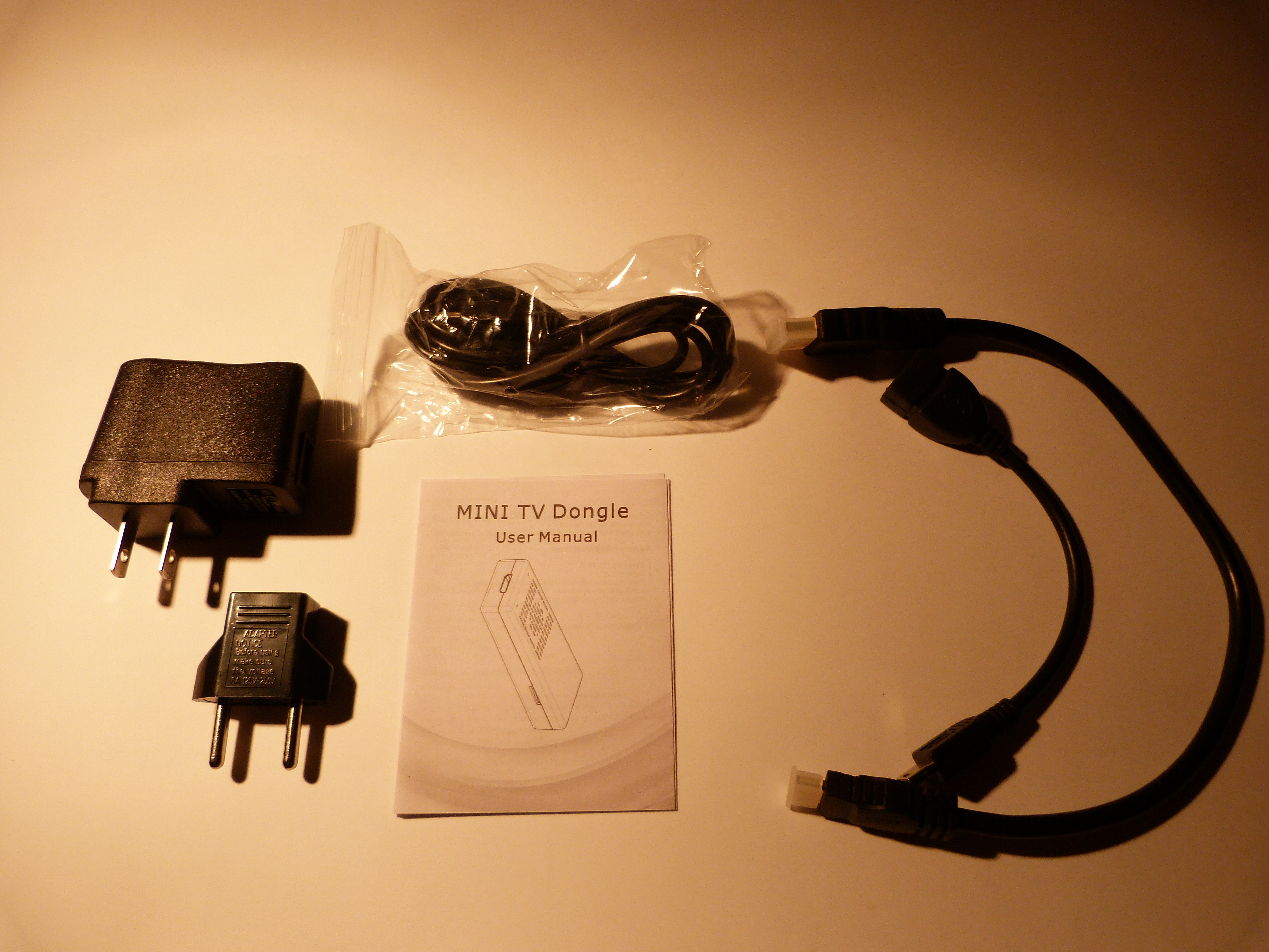 Der Stick kommt in einer simplen Plastikverpackung, enthalten sind neben dem Stick eine Kurzanleitung, ein USB-Kabel, ein HDMI-Kabel, ein OTG-Adapter, ein Ladestecker sowie ein Adapter für deutsche Steckdosen. Es ist also bereits alles im Paket enthalten um direkt loslegen zu können.