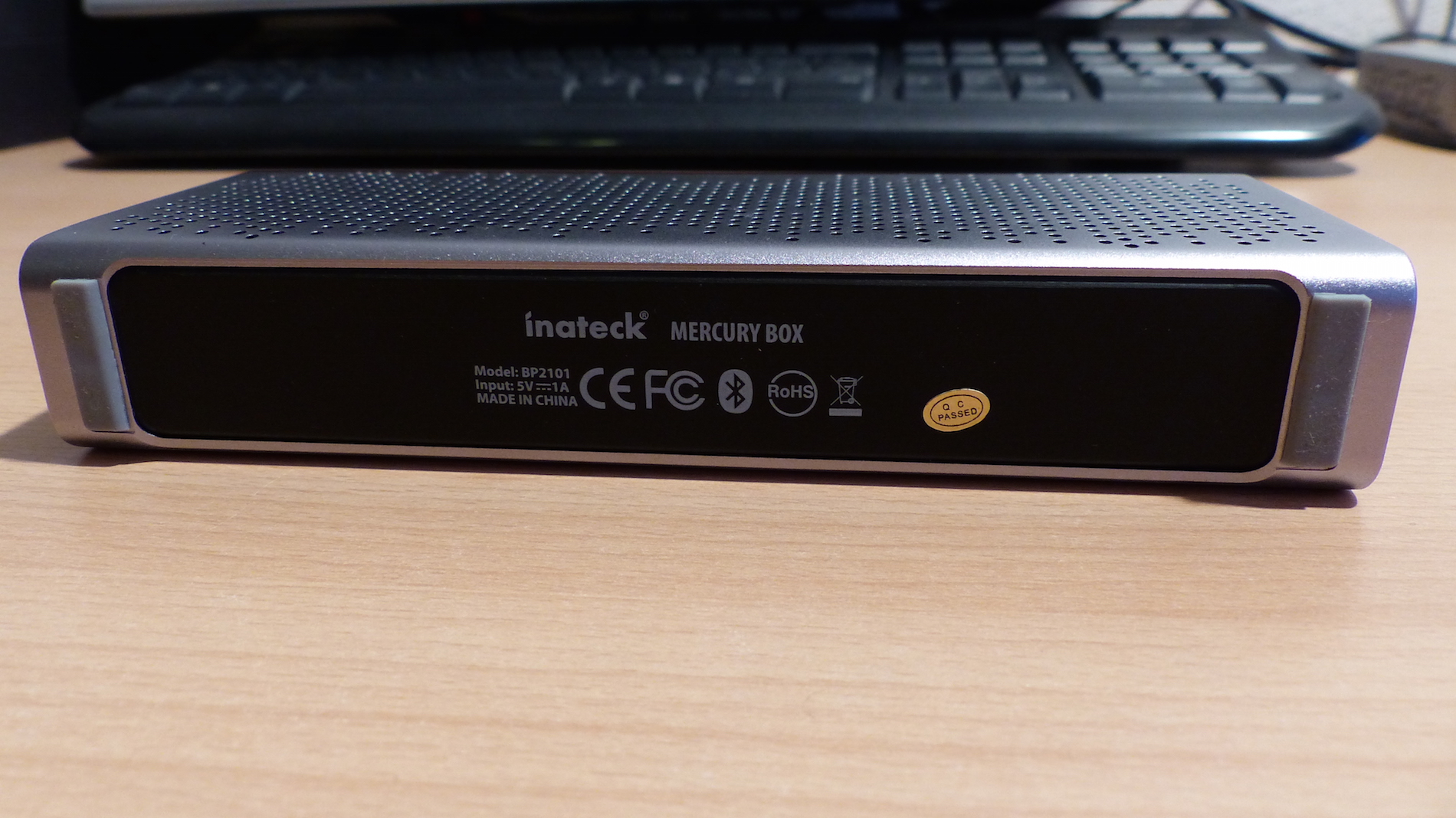 Das Design der Inateck Mercury Box würde ich als Eigenwillig bezeichnen. Das Teil ist nicht wirklich eine Schönheit, hässlich ist es aber auch nicht. Der Lautsprecher ist überraschend schlank, was dazu führt, dass er eigentlich fast nicht auffällt. Das Aluminium aus dem der Großteil des Gehäuses besteht ist dick und wirkt damit sehr solide. Ein Zusammendrücken oder Biegen des Geräts ist von Hand nicht möglich. Die Standfestigkeit wird durch Gummifüße gewährleistet. Im Endeffekt bringt das aber nicht viel, denn der Lautsprecher kippt dadurch, dass er so dünn ist sehr leicht um.