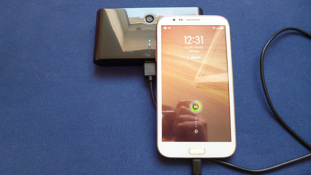 Das Aufladen eines Gerätes mittels der Power Bank funktioniert sehr einfach. Man nimmt einfach das mitgelieferte Kabel und steckt dort einen der Adapter auf. Man kann natürlich auch das USB Kabel verwenden, welches dem zu ladenden Gerät beilag. Nachdem das zu ladende Gerät an die Power Bank angeschlossen wurde, startet man den Ladevorgang mit einem Druck auf den Power Knopf der Power Bank. Nun beginnt die Status LED der Power Bank zu leuchten und zeigt immer den aktuellen Ladestand an. Ist das Gerät voll, so schaltet sich die Power Bank automatisch wieder ab.