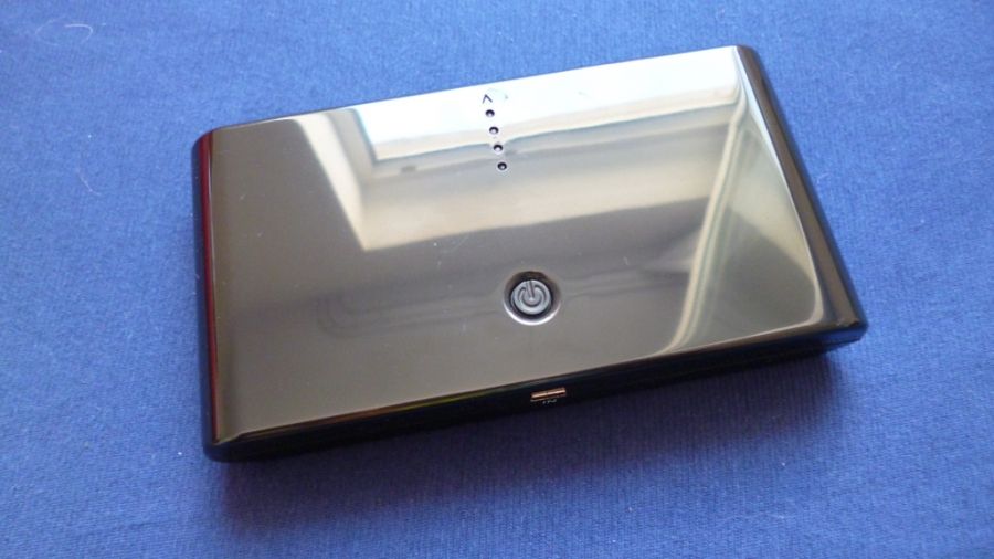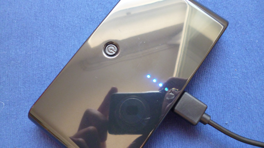 Der erste Eindruck des Geräts war durchaus gut. Das Gehäuse besteht aus schwarzem Kunststoff mit Hochglanzoptik. Leider befinden sich auf der Oberfläche stellenweise kleinere Fertigungsfehler, was aber nur bei genauerem Hinsehen auffällt. Eine übermäßig gute Verarbeitung haben wir auch nicht erwartet. Die Power Bank ist sehr einfach aufgebaut. Auf der Oberseite befindet sich ein Knopf sowie eine Reihe von LEDs. Drückt man den Knopf, so zeigen die LEDs den Ladezustand an.