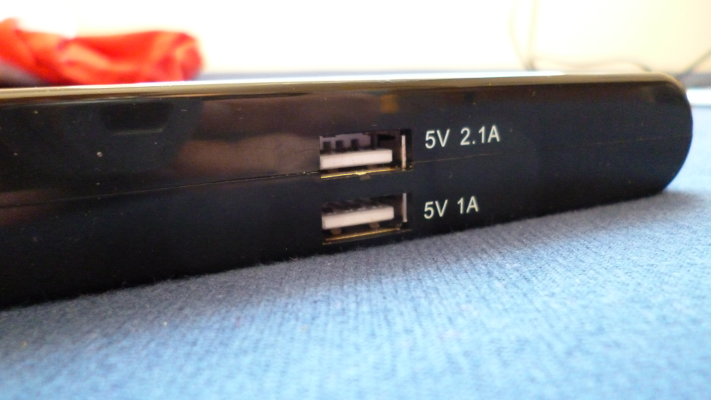 Auf der gegenüberliegenden Seite befinden sich zwei USB Anschlüsse, an welchen man Geräte zum Aufladen an die Power Bank anschließen kann. Man findet dort auch die Aufschrift 2,1A und 1A. Tablets sollten laut Hersteller zum Laden also an den stärkeren USB Anschluss angeschlossen werden. Beide Anschlüsse liefern eine Spannung von 5V.