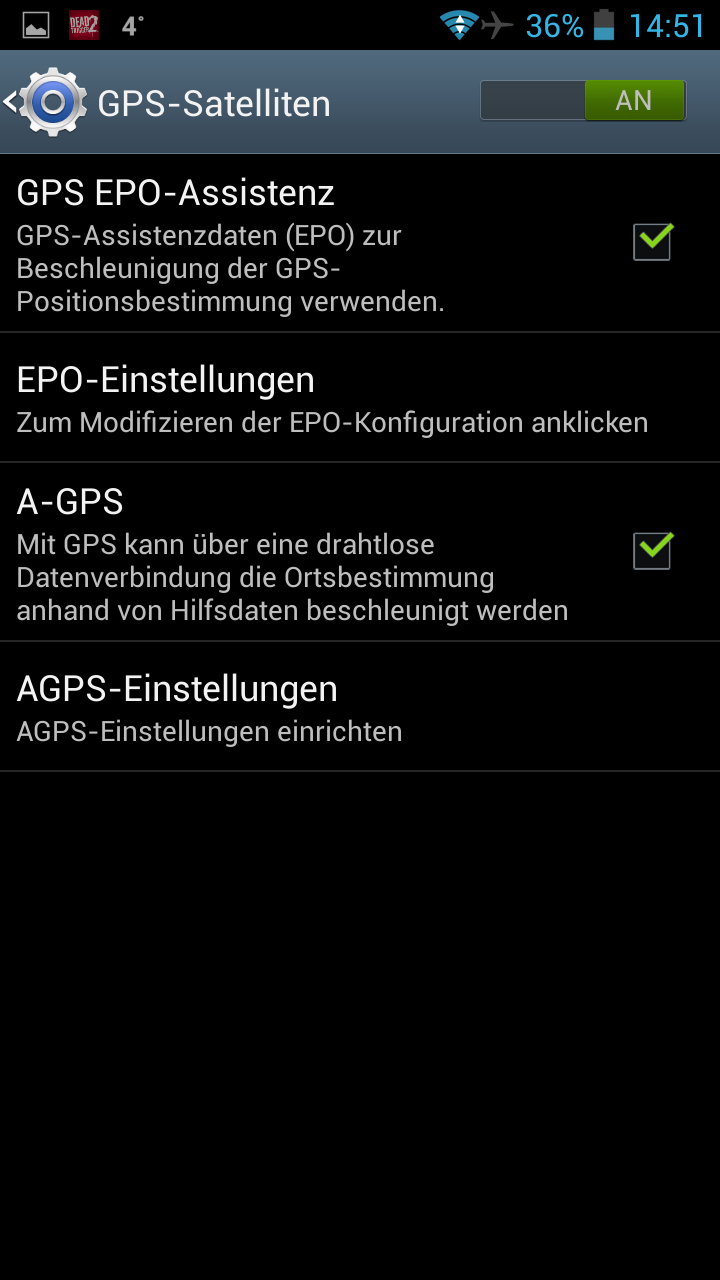 Hier setzt ihr nun einen Haken bei "GPS EPO-Assistenz" und bei "A-GPS". Bitte achtet darauf auch gleich die 3G Verbindung zu aktivieren, also WLAN am besten gleich ausschalten. Jetzt tippt ihr auch "EPO-Einstellungen".