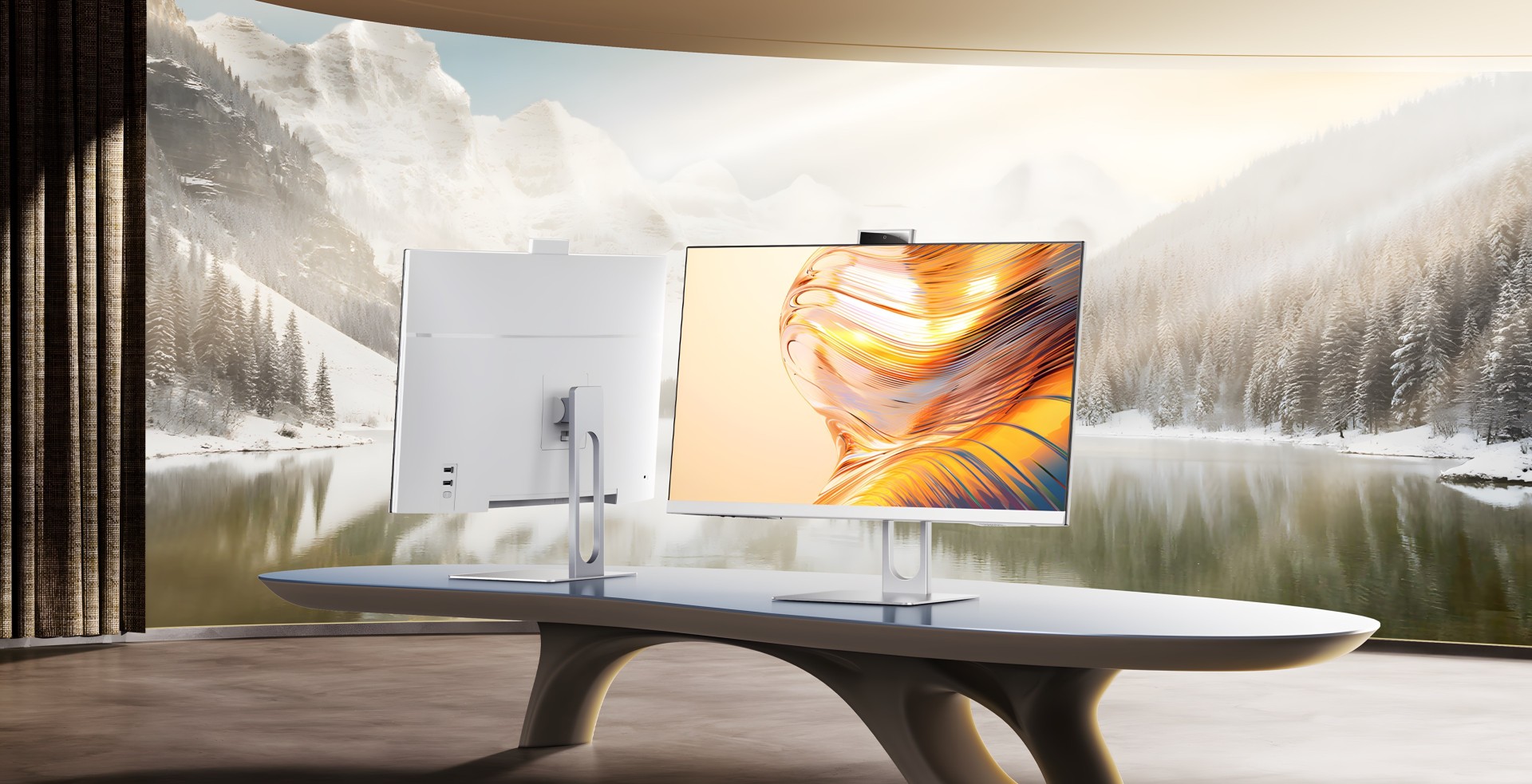 Für den Ton sorgen bei beiden Modellen zwei 3 Watt Lautsprecher im unteren Bereich des Gehäuses. Das Design orientiert sich optisch an klassischen Monitoren und verzichtet auf auffällige Gestaltungselemente. Silber ist die einzige verfügbare Farbvariante. Beide Systeme werden mit vorinstalliertem Windows 11 Pro ausgeliefert.