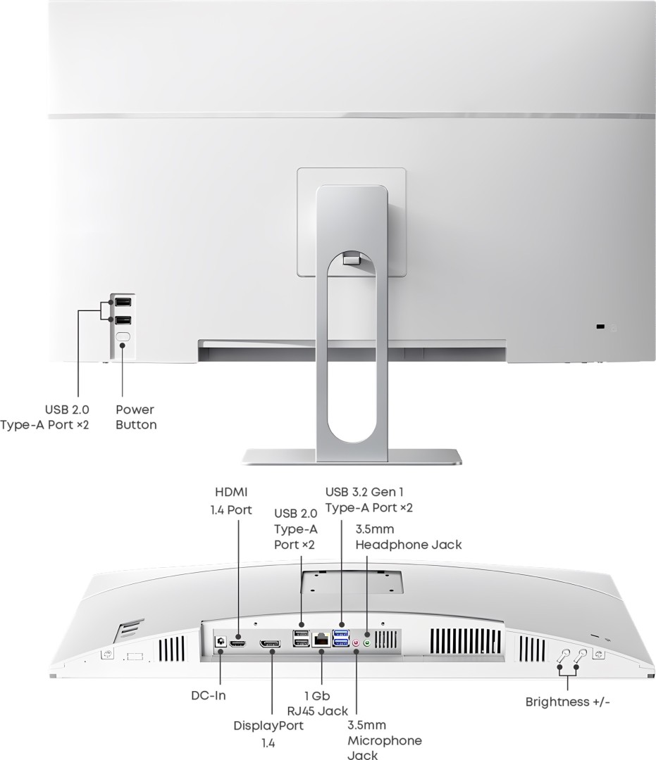 Die Anschlussausstattung unterscheidet sich leicht vom größeren Modell. An der Rückseite befinden sich 2× USB 2.0 Typ A, an der Unterseite weitere 2× USB 2.0 Typ A, 2× USB 3.2 Gen 1 Typ A, HDMI 1.4, DisplayPort 1.4, Gigabit Ethernet sowie die Anschlüsse für Mikrofon, Kopfhörer und Strom. Auch hier sind WiFi 6 und Bluetooth 5.2 integriert. Zusätzlich befinden sich an der Unterseite zwei Tasten zur Helligkeitsregelung.
