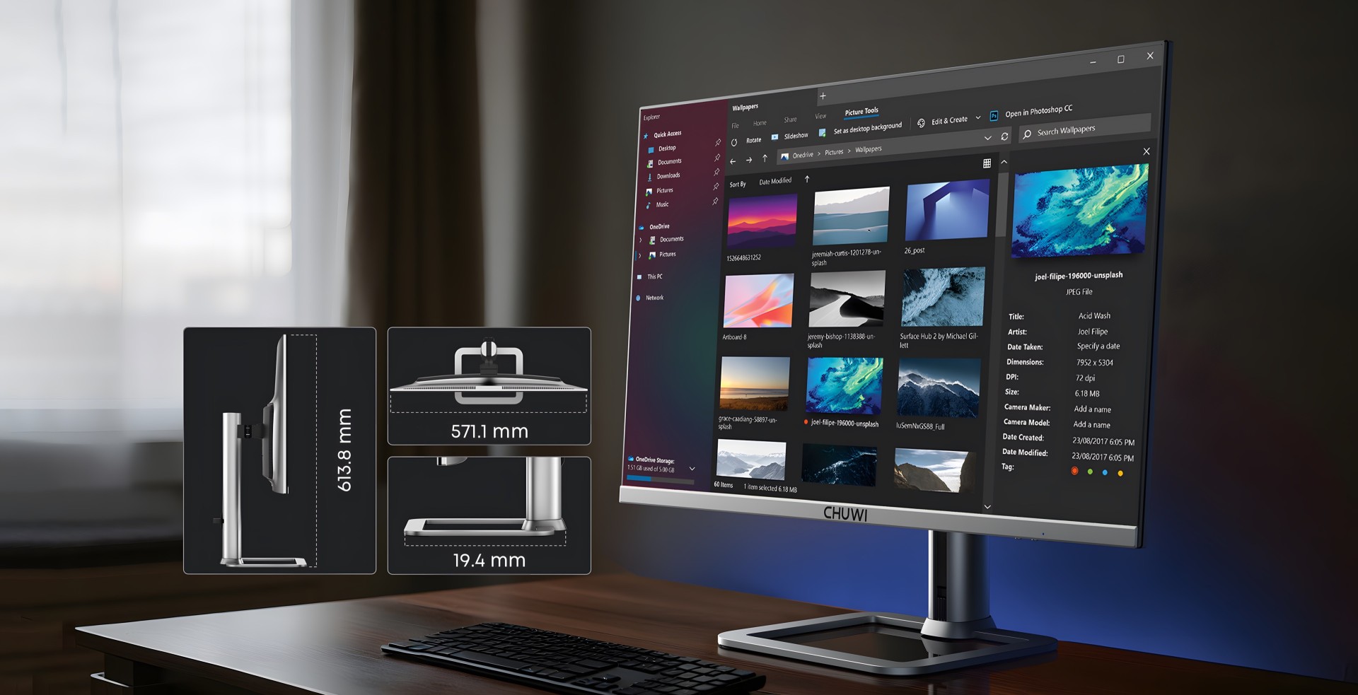 Das 23,8 Zoll IPS Display des Chuwi Unitech 24 löst mit 1920 × 1080 Pixeln auf und bietet eine Bildwiederholrate von 100Hz. Der Farbraum wird mit 99% sRGB angegeben, das Seitenverhältnis beträgt 16:9 und die Spitzenhelligkeit liegt bei 250 Nits. Das Bildschirm-zu-Gehäuse-Verhältnis beträgt 93%.