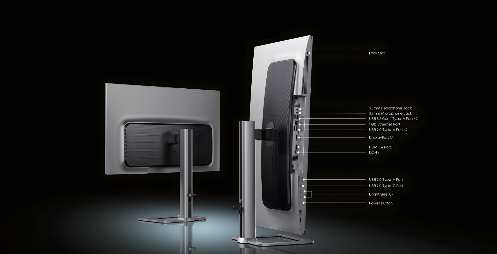 Das Gehäuse misst 613,8 × 571,1 × 19,4mm und wiegt etwa 7,1kg. Der mitgelieferte Standfuß ist höhenverstellbar mit einem Hub von 130mm und bietet zusätzlich Neigung von -5° bis 20°, Schwenkbarkeit von ±30° sowie eine Drehung von ±90°. Die Kühlung erfolgt über einen Lüfter und Kühlkörper mit mehreren Heatpipes, das mitgelieferte Netzteil leistet 120 Watt.