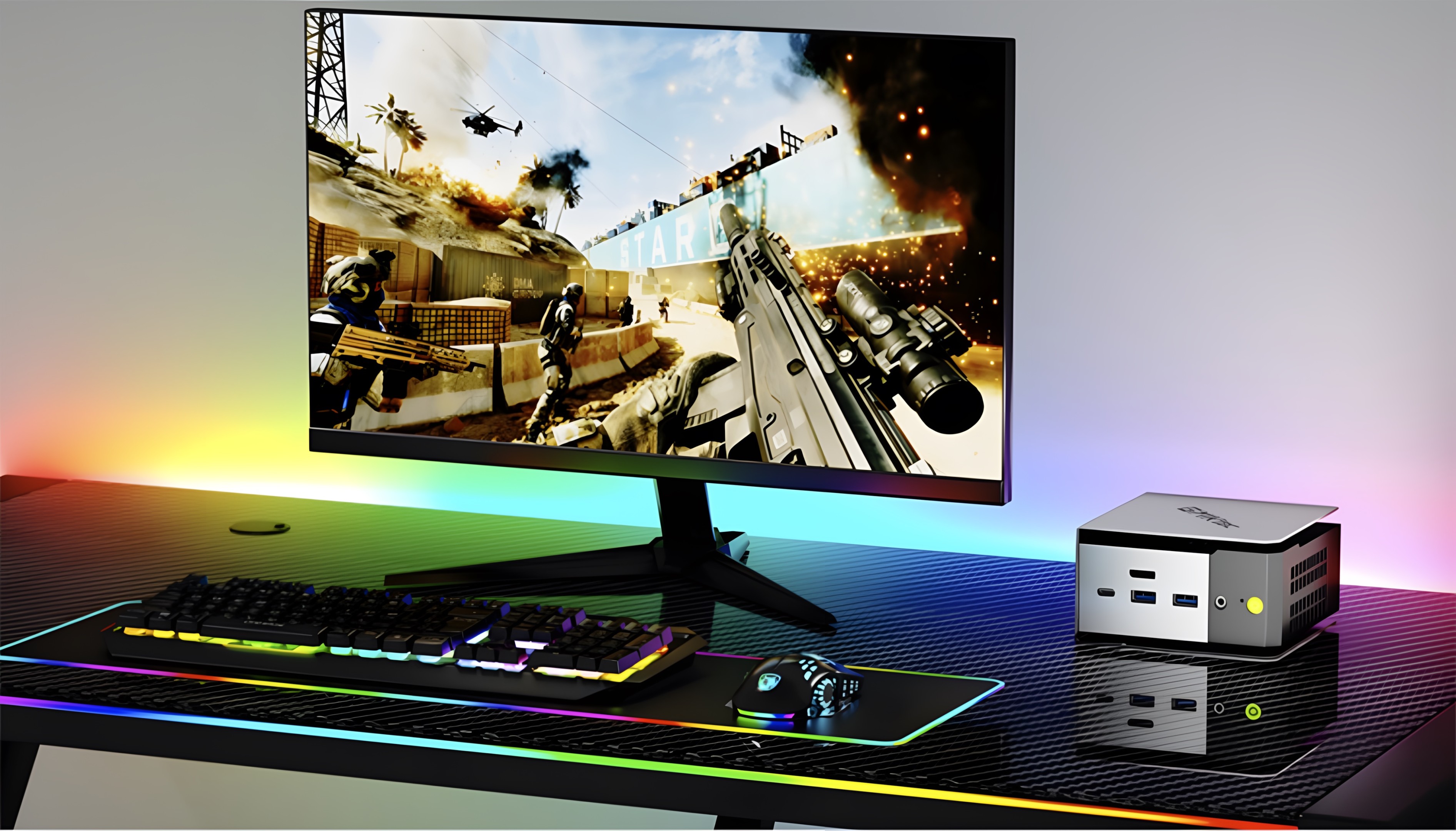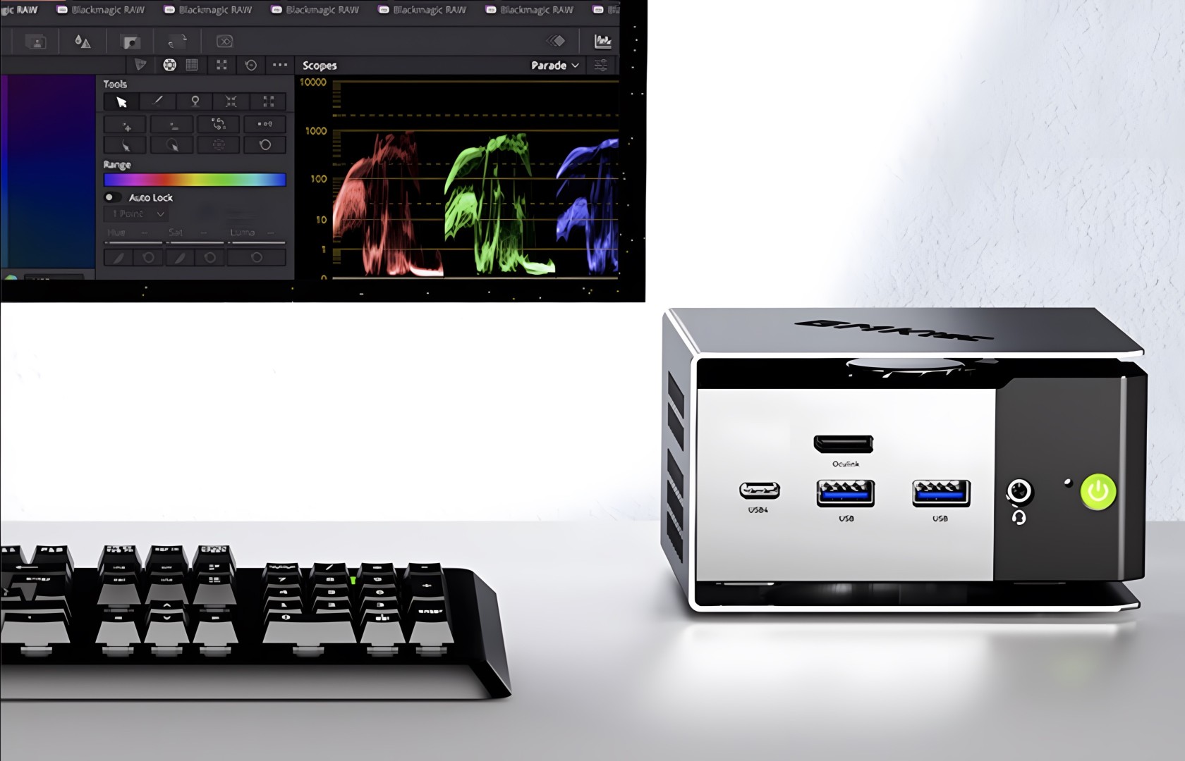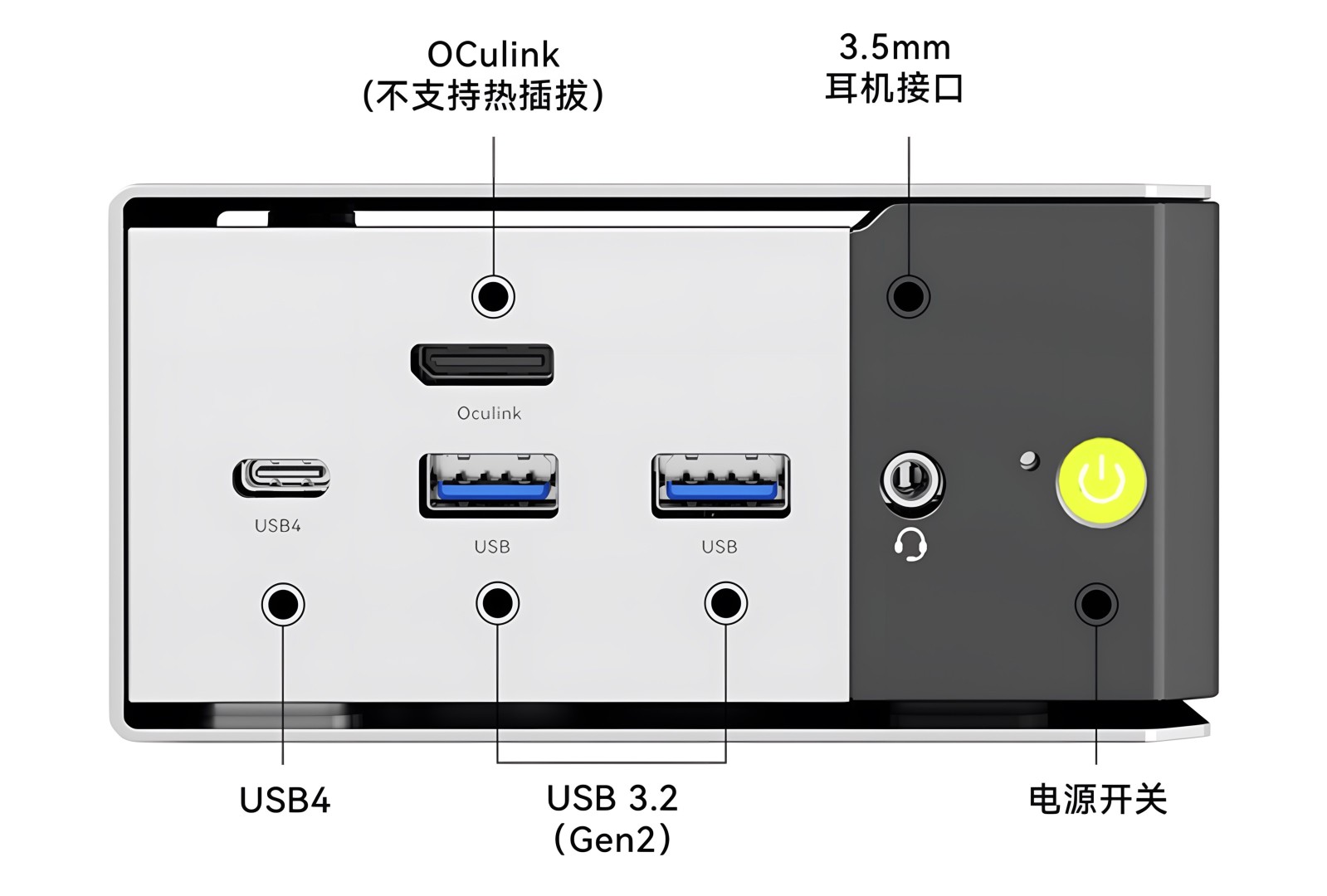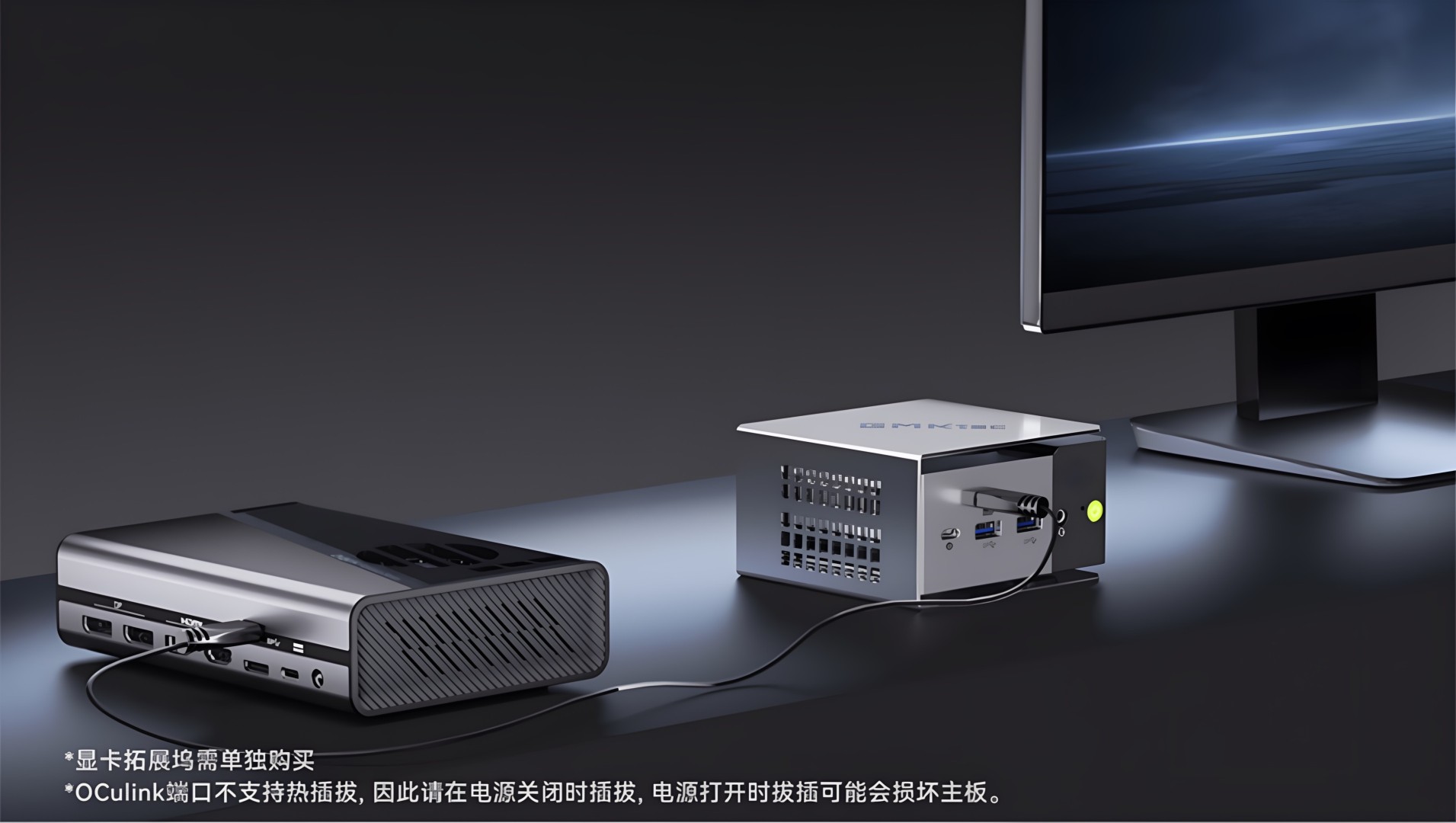 Eine Besonderheit des M8 liegt in seiner Fähigkeit, externe Grafikkarten anzubinden. Gerade bei derart kleinen Mini PCs ist das nicht die Norm. Dabei bietet der Hersteller sogar die Wahl zwischen zwei Anschlussmöglichkeiten. An der Frontseite befindet sich ein OCuLink 4i Port mit PCIe 4.0 x4 Anbindung. Über diese Schnittstelle lassen sich Desktop-Grafikkarten in externen Gehäusen betreiben, was die Grafikleistung für Gaming oder professionelle Anwendungen erheblich steigern kann. Alternativ steht ein USB 4 Port mit 40Gbit/s Bandbreite zur Verfügung, der ebenfalls die Anbindung externer GPUs über Thunderbolt 3/4 ermöglicht.
