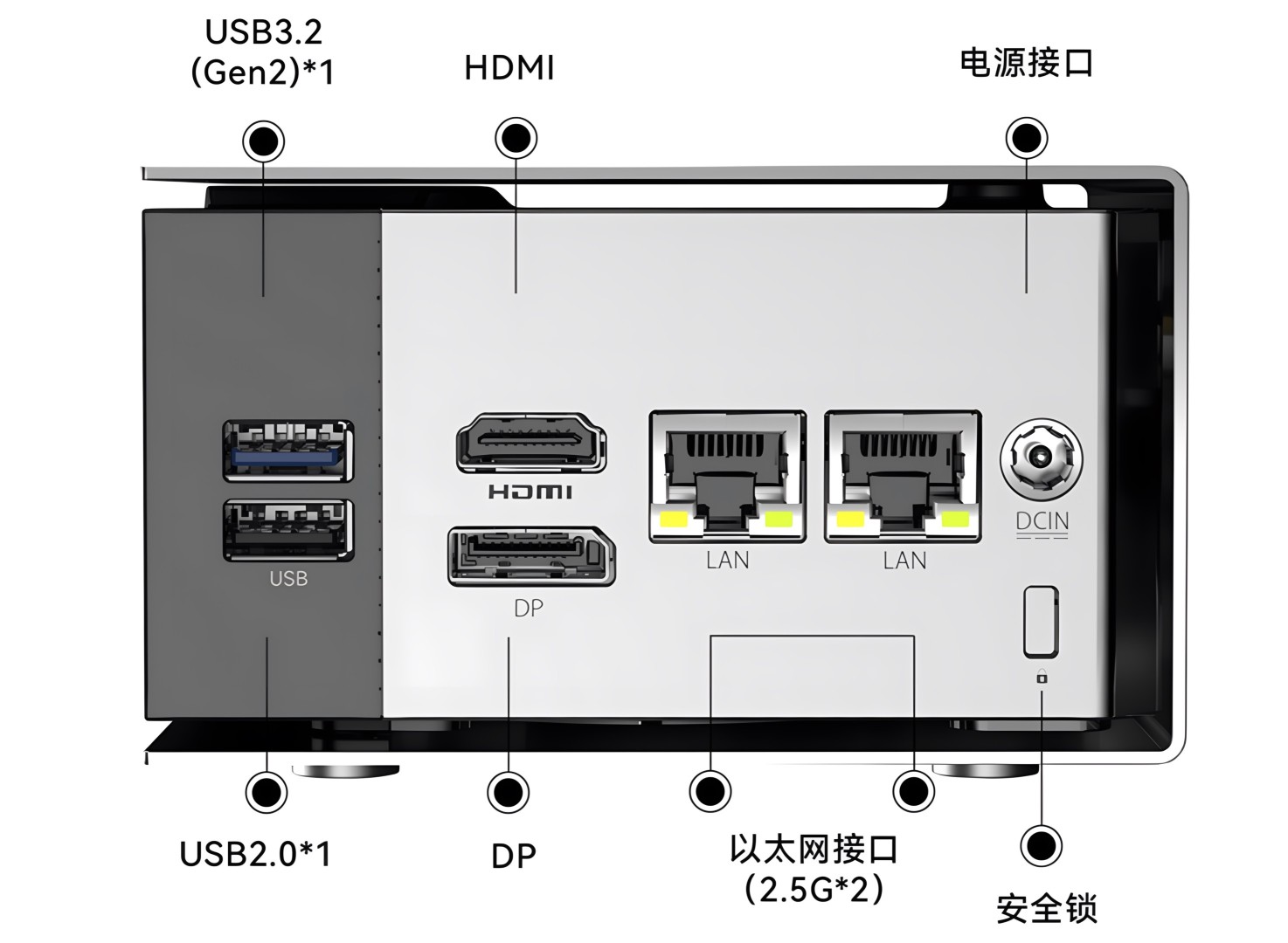 Die Frontseite des Gehäuses beherbergt neben dem OCuLink Port auch zwei USB-A Anschlüsse mit 10Gbit/s sowie einen 3,5mm Klinkenanschluss für Audio. Auf der Rückseite finden sich ein weiterer 10Gbit/s USB-A Port, ein USB 2.0 Anschluss, HDMI 2.0, DisplayPort 1.4 sowie zwei 2,5 Gigabit Ethernet Ports. Hinzu kommen der DC-Stromanschluss und eine Kensington Schlossaufnahme. Der GMKtec M8 soll laut Hersteller aber auch über USB-PD mit dem USB 4 Anschluss mit Strom versorgt werden können.