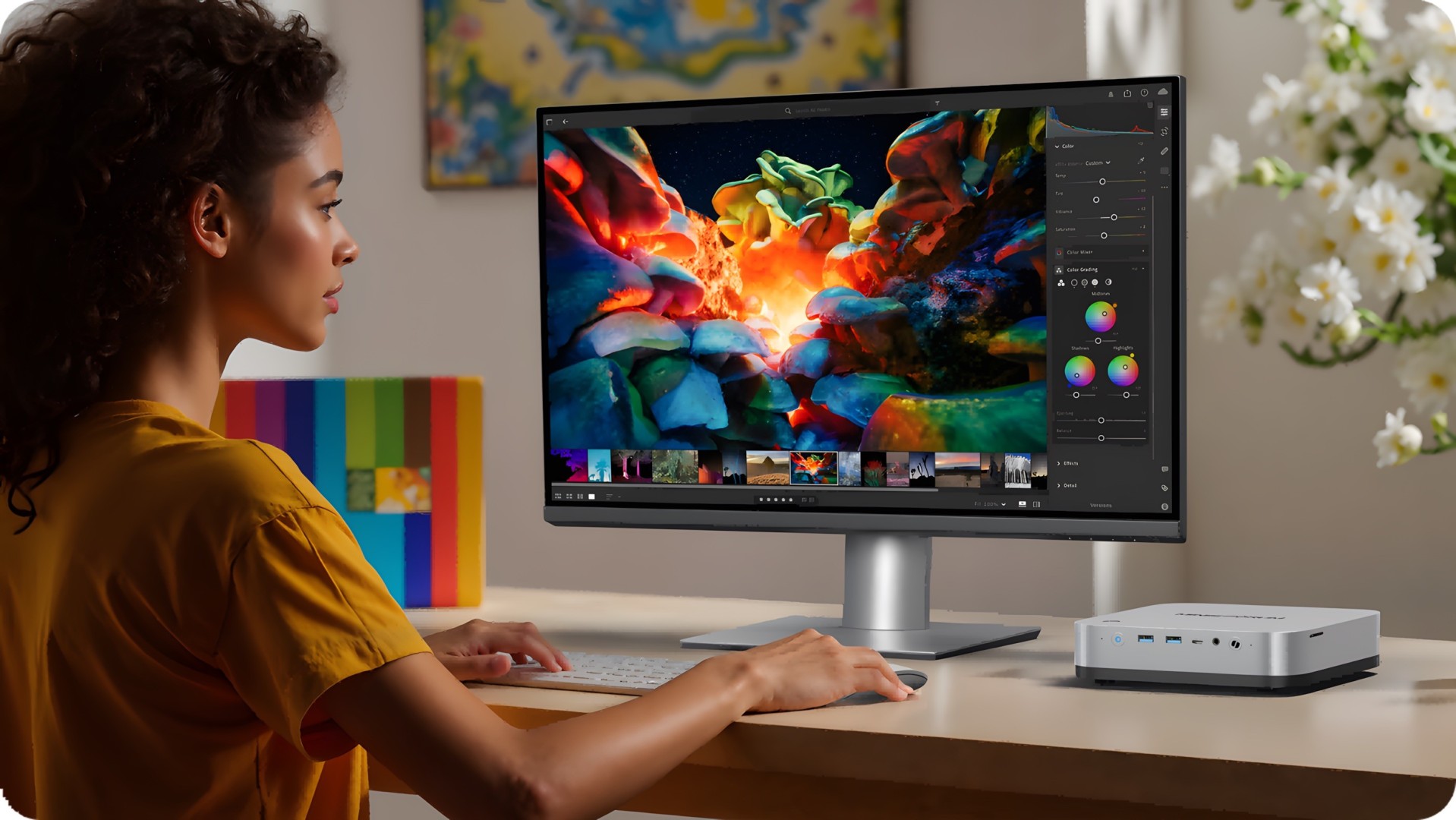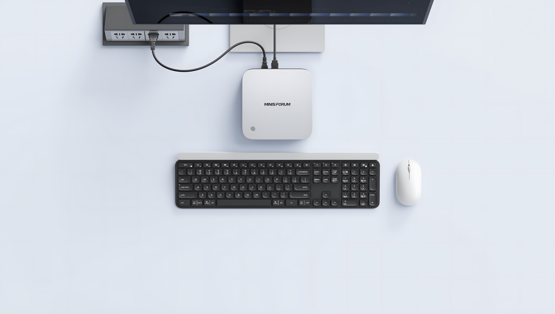 Ein spannendes Merkmal des Mini PC ist das integrierte 134,9W Netzteil. Anstelle eines externen Netzteilblocks, der bei Mini PCs oft störend wirkt, wird lediglich ein Kaltgerätekabel zur Stromversorgung benötigt. Dies sorgt für einen aufgeräumteren Arbeitsplatz. Die Anschlussausstattung ist modern gehalten. Für die Bildausgabe stehen ein HDMI 2.1 Port, ein DisplayPort 2.0 sowie zwei USB4 Anschlüsse zur Verfügung. Letztere unterstützen auch DisplayPort Alt Mode, sodass insgesamt bis zu vier Bildschirme mit 4K Auflösung gleichzeitig betrieben werden können. Ergänzt wird dies durch zwei RJ45 Buchsen für 2.5 Gigabit Ethernet, diverse USB Typ A Ports und einen SD Kartenslot. Drahtlos kommuniziert der Rechner via Wi-Fi 7 und Bluetooth 5.4.