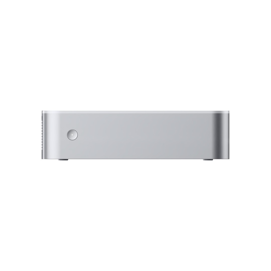 Das Gehäusedesign fällt ungewöhnlich zurückhaltend aus. Mit Abmessungen von 195x193x51,9mm und einem Gewicht von 1,12kg ordnet sich der Minisforum M1-1295 in die Kategorie der kompakten Desktop-Rechner ein. Die Konstruktion aus Metall verzichtet vollständig auf frontseitige Anschlüsse und beschränkt sich dort auf einen Netzschalter. Sämtliche Schnittstellen befinden sich an der Rückseite, was zu einem aufgeräumten Erscheinungsbild führt, allerdings den Zugang zu häufig benötigten Anschlüssen erschwert.