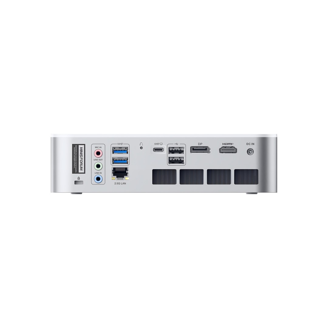 Die USB-Bestückung umfasst vier USB-A Anschlüsse, davon zwei nach USB 2.0 Spezifikation und zwei mit USB 3.2 Gen2. Der USB-C Port bietet neben der Videofunktion eine Datenrate von 10Gbit/s und kann angeschlossene Geräte mit 15 Watt versorgen. Ein einzelner 2,5 Gigabit Ethernet Port mit Realtek RTL8125-Chipsatz deckt die kabelgebundene Netzwerkanbindung ab, während Wi-Fi 6E und Bluetooth 5.2 über ein MT7902-Modul realisiert werden.