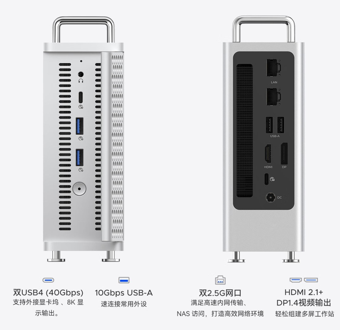 Die Anschlussausstattung fällt ähnlich umfangreich aus wie beim größeren Modell. Verfügbar sind zwei USB4 Ports, zwei USB Typ-A Anschlüsse mit 10Gbit/s, zwei weitere USB Typ-A Ports mit 480Mbit/s, DisplayPort 1.4, HDMI 2.1, zwei 2,5Gbit/s Ethernet Buchsen sowie eine 3,5mm Klinkenbuchse. Produktbilder zeigen zwei DDR5 RAM Slots sowie zwei M.2 PCIe Steckplätze für SSDs. Das Kühlsystem erscheint nach den verfügbaren Abbildungen ausreichend dimensioniert. Der Hersteller wirbt mit werkzeuglosem Zugang für Aufrüstungen.