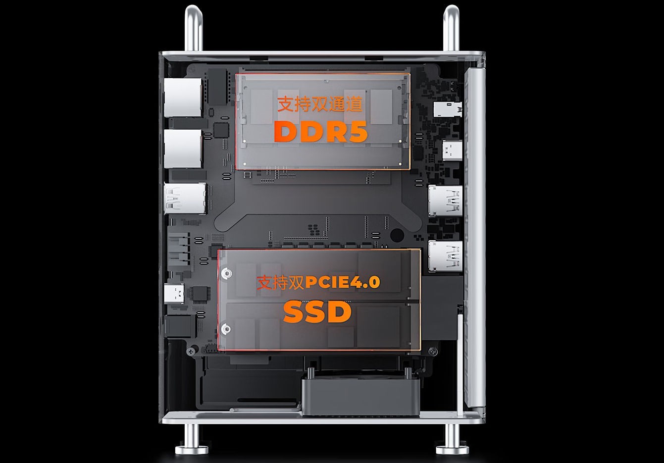 Technisch setzt Orico auf den AMD Ryzen 7 8845HS, eine APU mit 8 Kernen und 16 Threads, die Taktraten zwischen 3,8GHz und 5,1GHz erreicht. Die integrierte Radeon 780M Grafiklösung basiert auf der RDNA 3 Architektur und verfügt über 12 Compute Units mit einer Taktrate von 2700MHz. Für anspruchsvollere Grafikanwendungen besteht die Möglichkeit, externe Grafikkarten über USB4 anzubinden, wobei die begrenzte Bandbreite dieser Schnittstelle einen Leistungsengpass darstellt. nichts desto trotz lässt sich die Grafikleistung dadurch erheblich steigern.